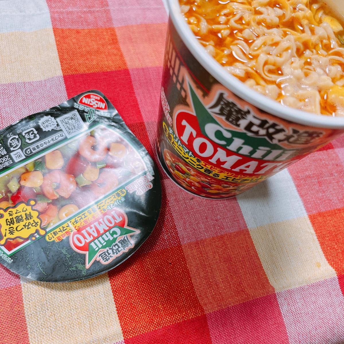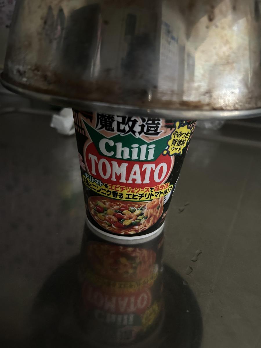 魔改造のネームに惹かれて普通のカップヌードルと一緒に買いました。チリトマトのピリ辛缶があまりなく、エビチリの甘みが微かに感じられるユニークな味のスープです。