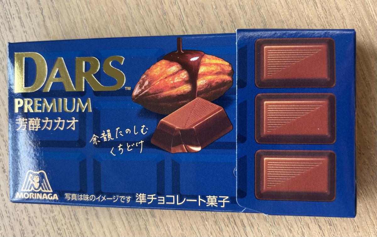 芳醇カカオのネーミングに惹かれてどんな味か試したく購入してみました。パッケージの色合いもいい感じです。一口食べるとコクのあるダークミルク感が感じられました。ヘーゼルナッツペーストが風味を出していて、バターオイルのコクがあり濃厚です。ミルク感もあり、定番のDARSミルクと似た風味でした。ややカカオ感がアップしている印象でした。