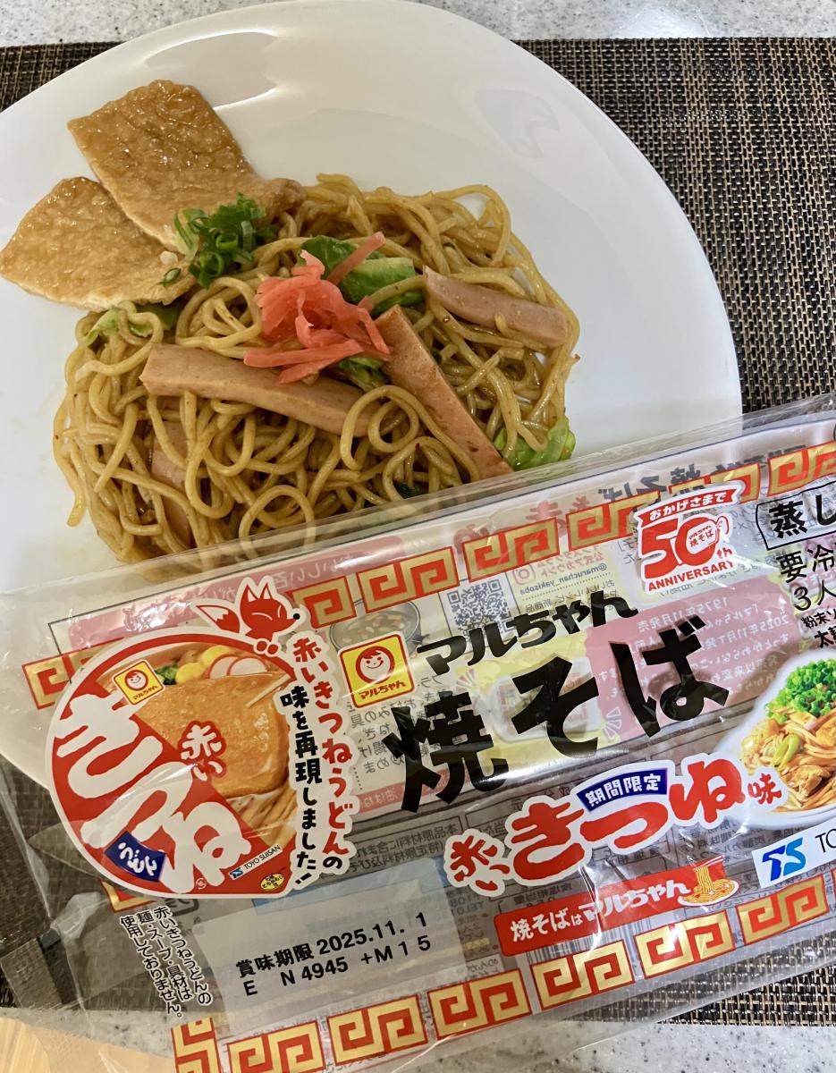 どんな味に仕上がるのか楽しみながら、具はキャベツと魚肉ソーセージを使いました。粉末は開封した瞬間に赤いきつね味の香りがして再現度の高さを感じます。お皿に焼きそばを盛り付けて本格さを出すために味付けいなりとねぎをトッピングしました。待ちに待った実食!麺はコシがあり細麺でいつものマルちゃん焼きそばで味はしっかりと赤いきつね味になっていてキャベツと魚肉ソーセージの具でも合い、味付けいなりとねぎと一緒に食べるとさらに赤いきつね味を引き立ててくれます。