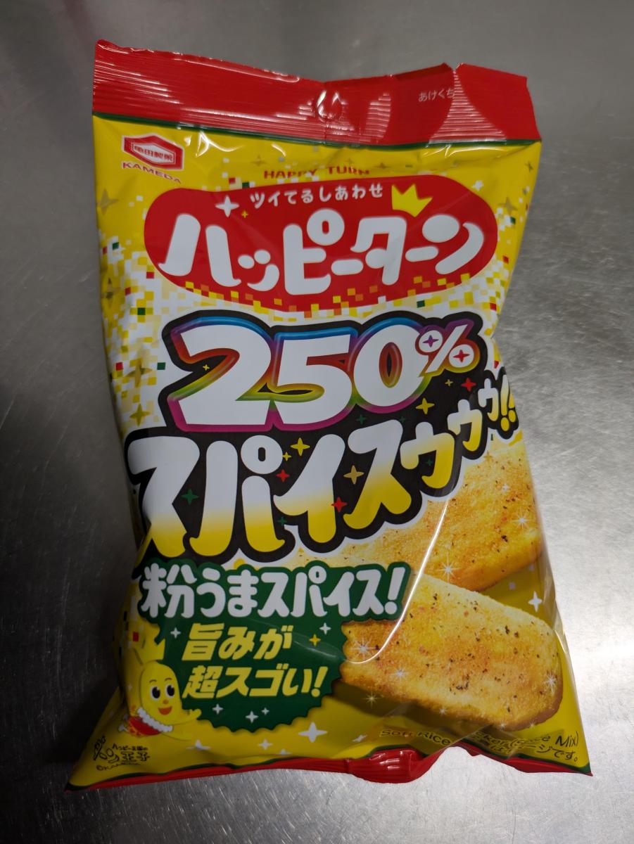 以前にふつうのハッピーターンスパイスを購入して好みの味だったから、250%を見つけて即購入!