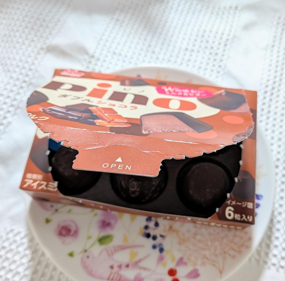 ピノのダブルショコラ。新商品です。見た目から冬っぽさを感じるアイスですね。