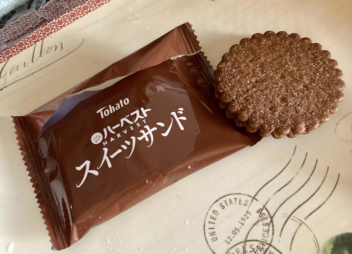 香ばしさがおいしいハーベストビスケットでクリームをサンドしたお菓子。
