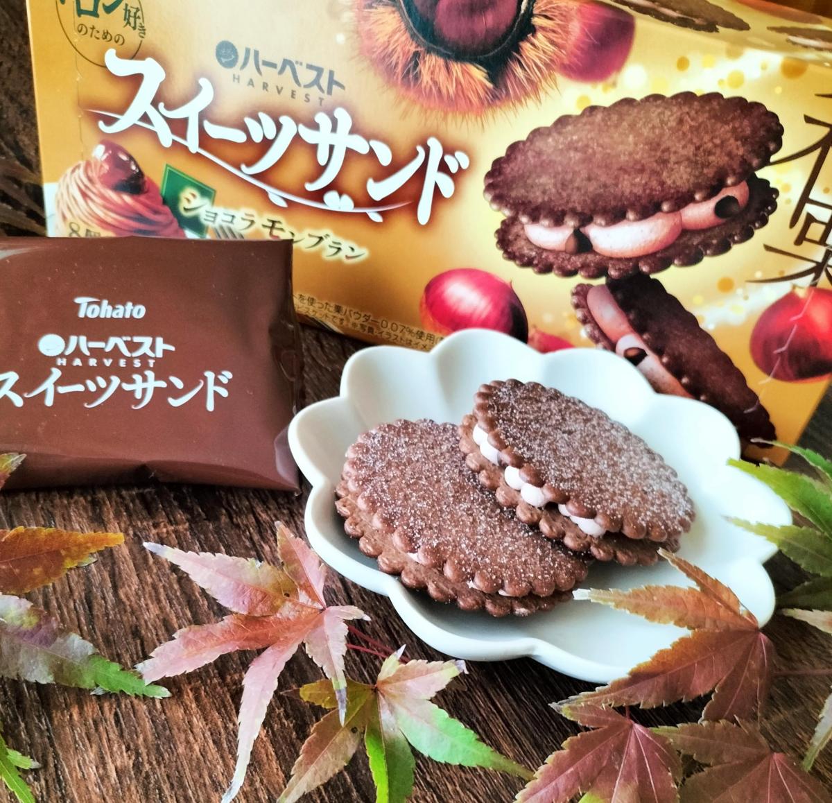 マロンクリームにチョコチップを散りばめ、チョコ味のハーベスト2枚でサンド。