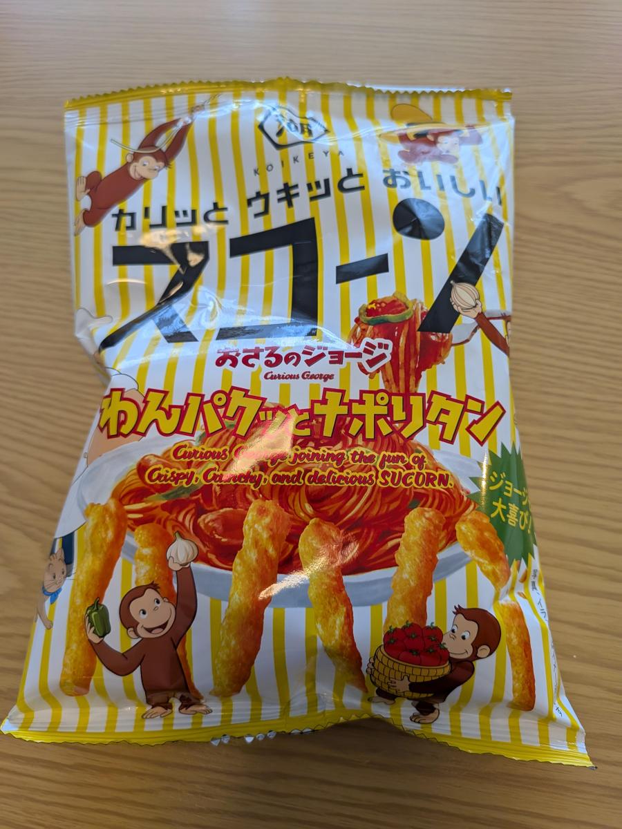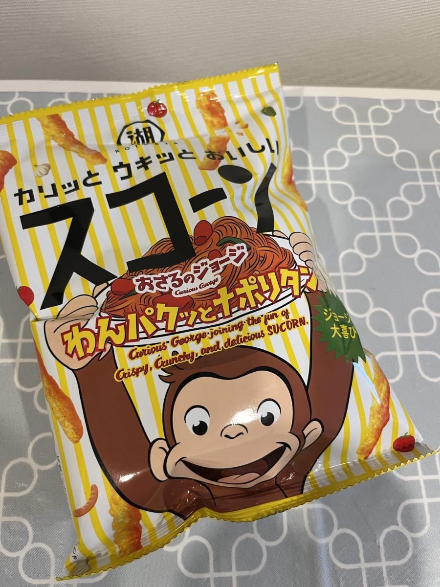 おさるのジョージのパッケージが目新しい感じです。ナポリタン味という事で期待して食べました。食感はサクサク軽く、良いです。味はナポリタン味とあまり感じませんでした。何味とも言いにくい、味が薄い気がしました。期待と大分違っていて残念でした。