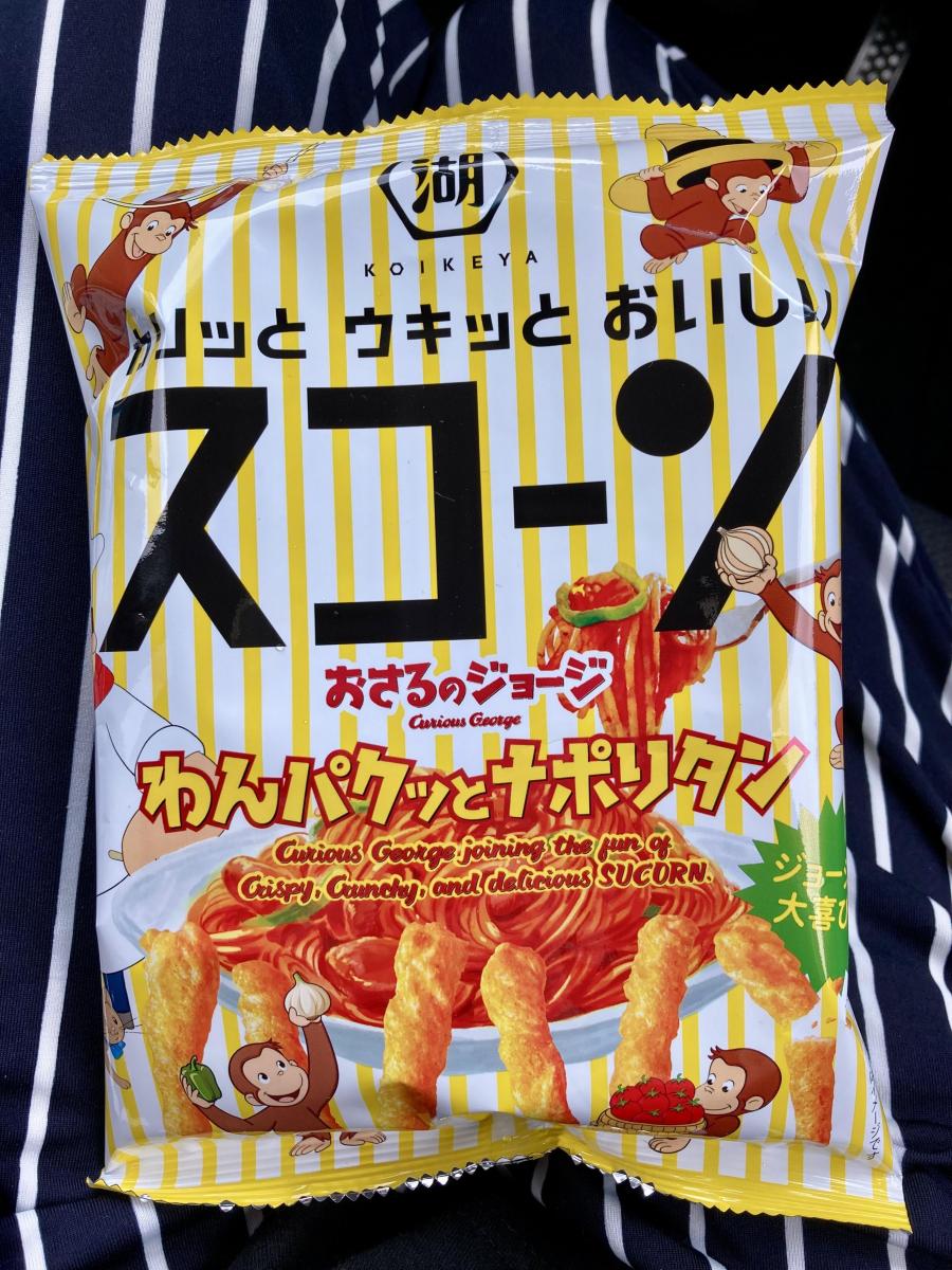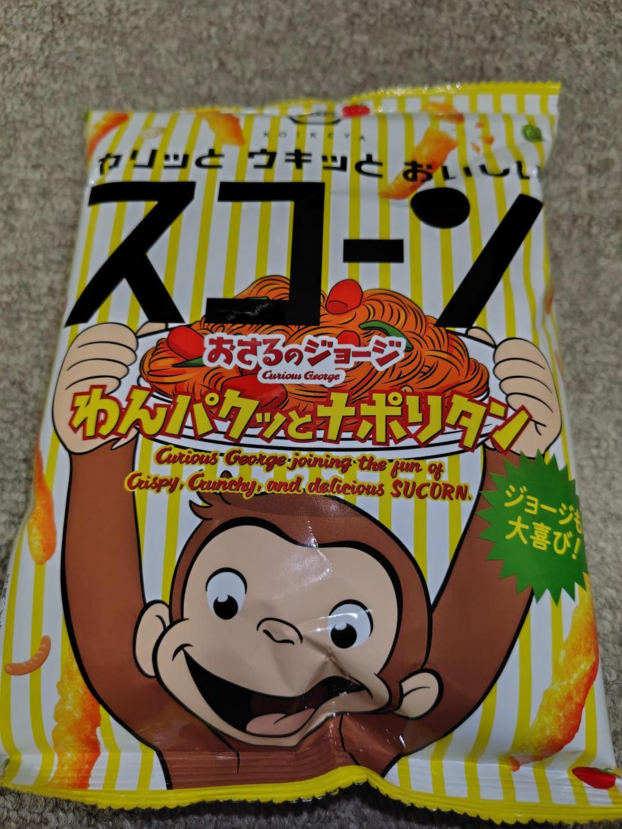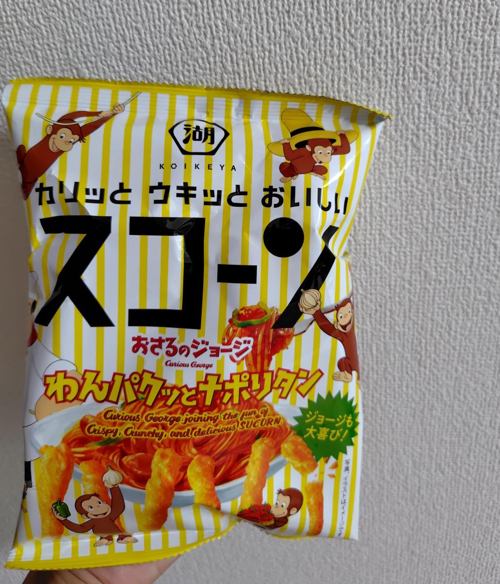 子供がおさるのジョージ大好きなので購入してみました。食べてみるとトマトケチャップのような味がして、たしかにナポリタン風ではありました。でもスパイスや旨味系の味もして、スコーンのバーベキュー味の方が強い感じ。バーベキュー味にケチャップをちょい足しした感じですかね。中途半端な味で、あと妙にパンチがないので、食べていてだんだん飽きてきてしまいました。ナポリタン味を再現するのは難しいと思いますが、もう少しナポリタン寄りでパンチのある味だと嬉しかったです。