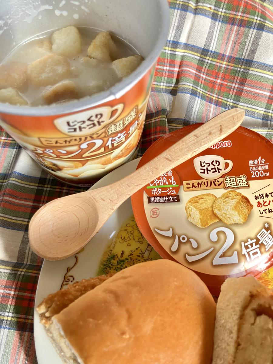 お湯を注いでスプーンでくるくる混ぜている時から燻製の香りがすごいです。まろやかでじゃがいものとろみ感もいいが燻製の味が少し強すぎると思いました。パンは確かにたっぷり入って食べ応えがあるが早めにべちゃっとしてしまうのがうーんって感じでした。パンは最初に食べた方がサクッとしておすすめですね。