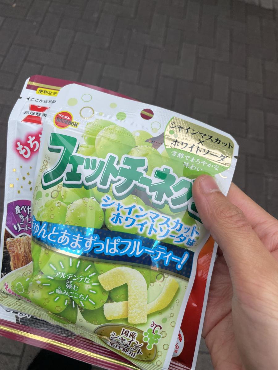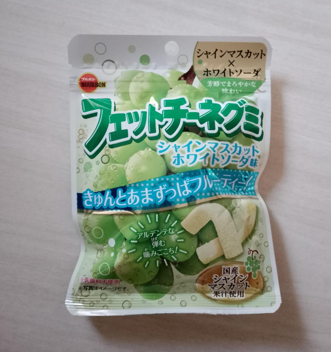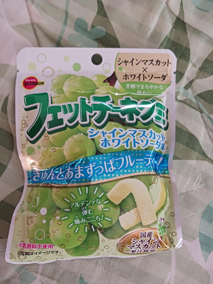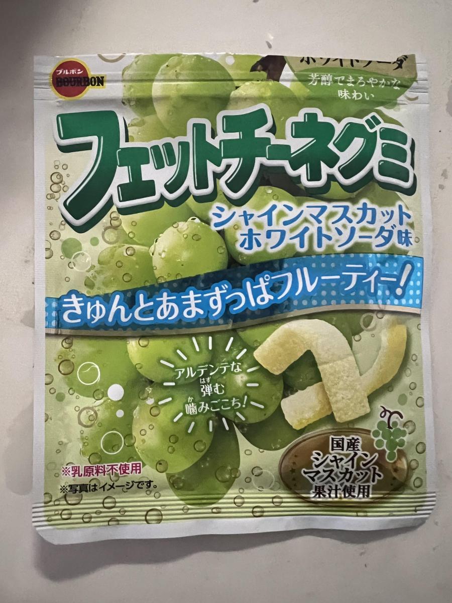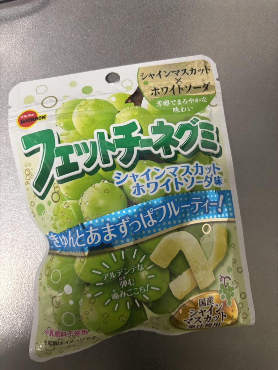 シャインマスカットの爽やかな甘味とホワイトソーダのしゅわわとした甘酸っぱさがたまらない!想像していたよりもマスカットの味や香りが濃厚で、ジューシーさが強く感じられて食べ応え◎。グミ表面のシャリシャリとしたパウダーも歯触り良く、トータルで美味しかったです。これはリピしたい。