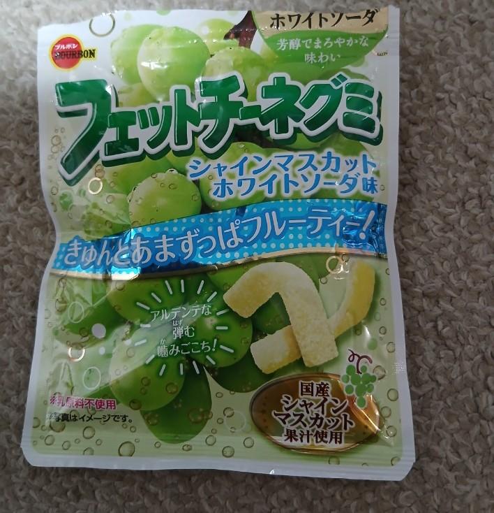 大好きなフェットチーネグミで味がシャインマスカットとホワイトソーダなら間違いないだろうと購入。結果は大当たりでした。定番のグレープより酸味が控えめでシャインマスカットとホワイソーダの甘さの組み合わせがばっちりはまって美味しいです。パッケージにはホワイトソーダと書かれていますが、カルピスのような味だとイメージすると分かりやすいです。
