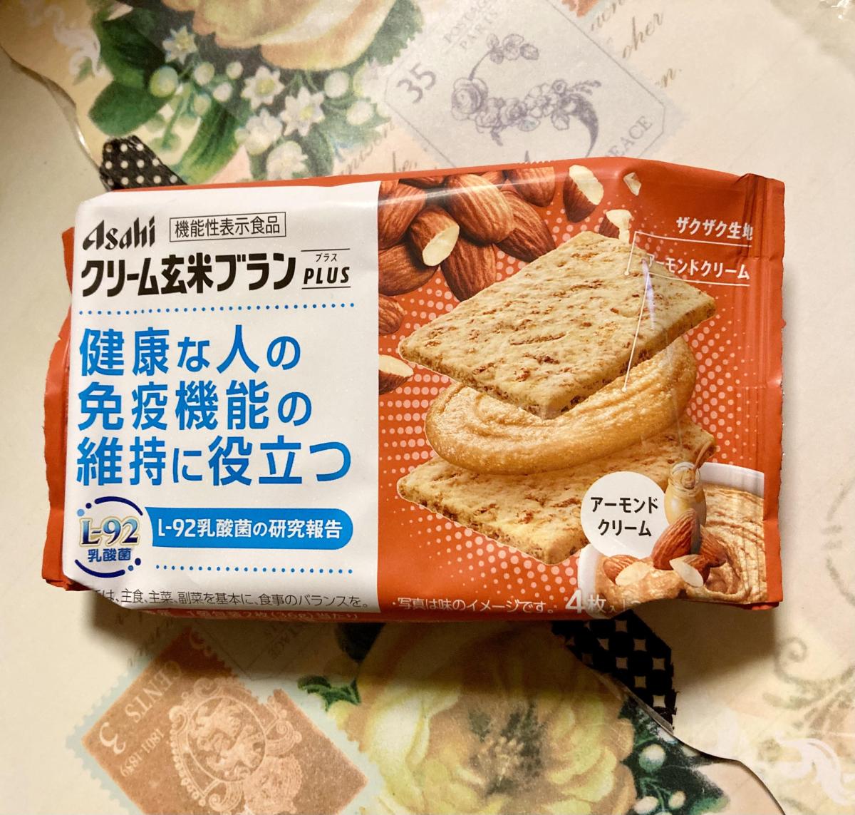このシリーズが大好きでクリーム玄米ブランプラス アーモンドクリーム味が気になり購入してみました。2つにわかれているのがいいです。玄米ブランのザクザクとした玄米の食感が香ばしくて大変美味しいです。アーモンドが香ばしくキャラメル風味の甘さとクリームの相性が良く、何だかピーナッツバターのような風味に感じ美味しかったです。