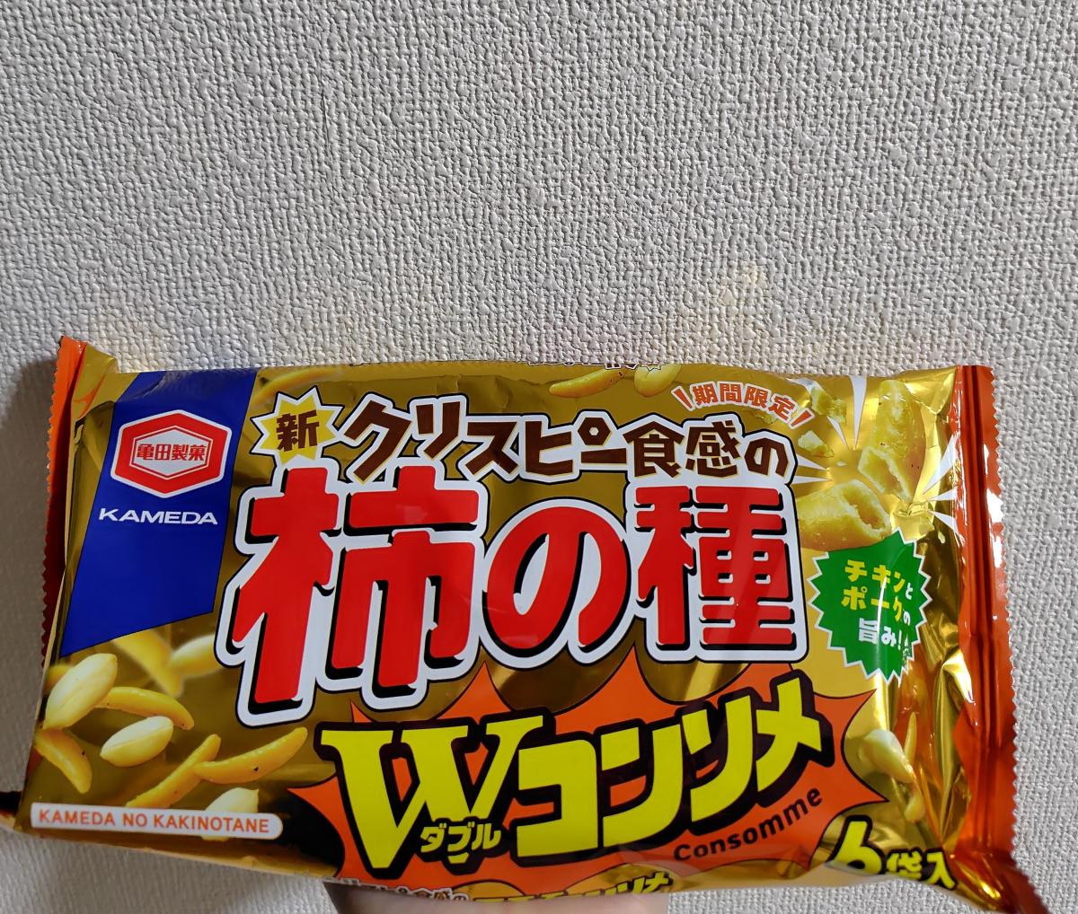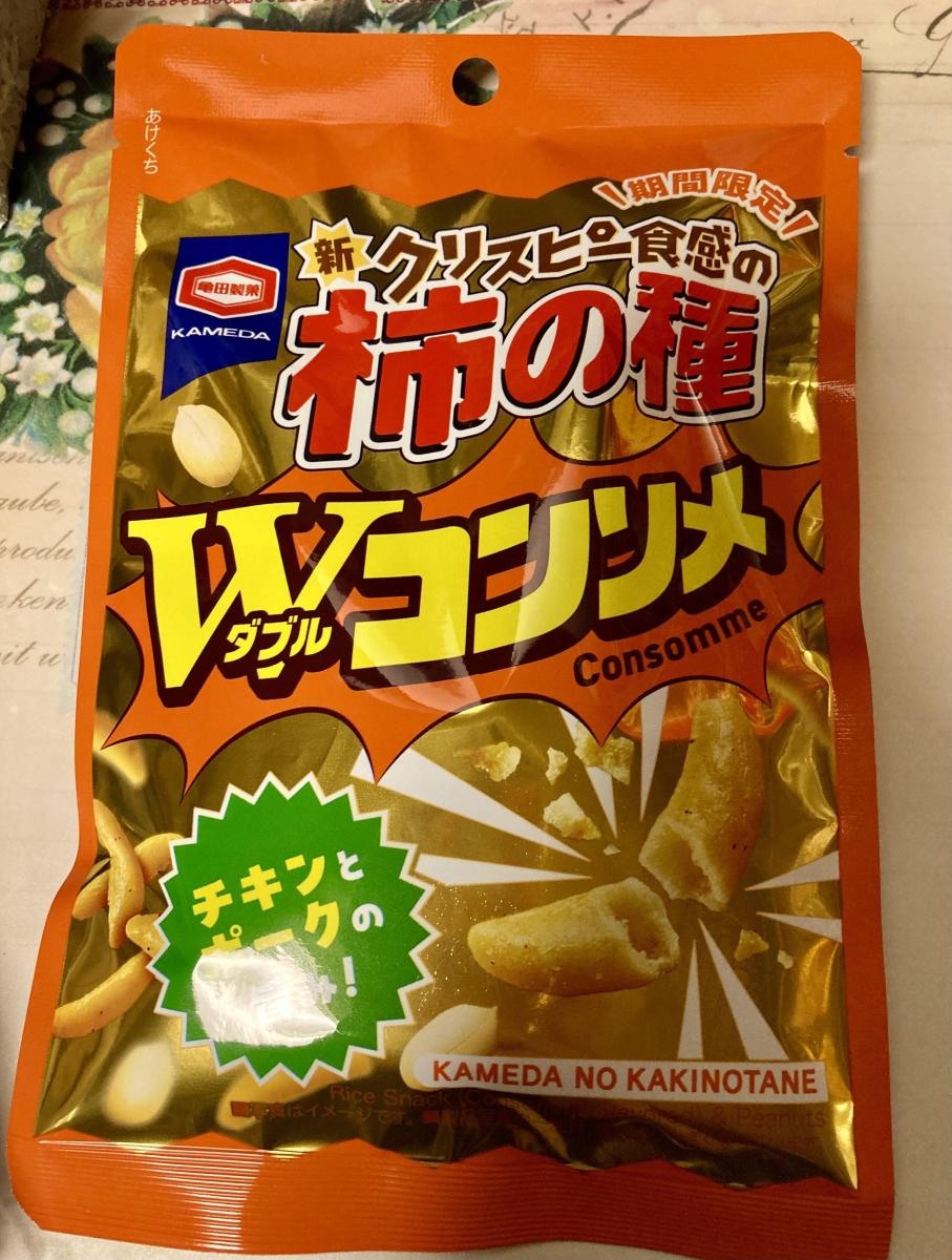 柿の種にブルコンソメ味と新しい味わいが出ていたので気になり購入してみました。柿の種のカリカリクリスピーな食感はそのままで軽くて大変美味しかったです。チキンとポークの2種類のお肉と野菜のうまみをぎゅっと詰め込んでいるそうで、奥深いコンソメの味わいで、何だかやみつきになるような味わいで美味しかったです。