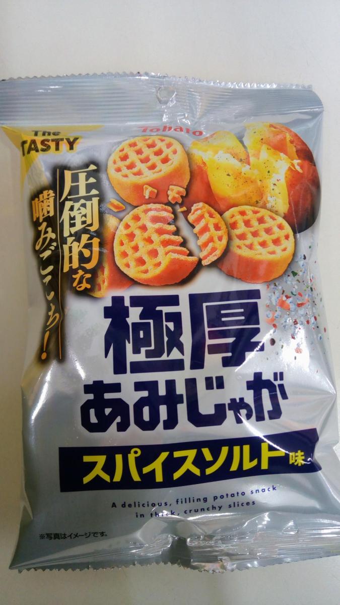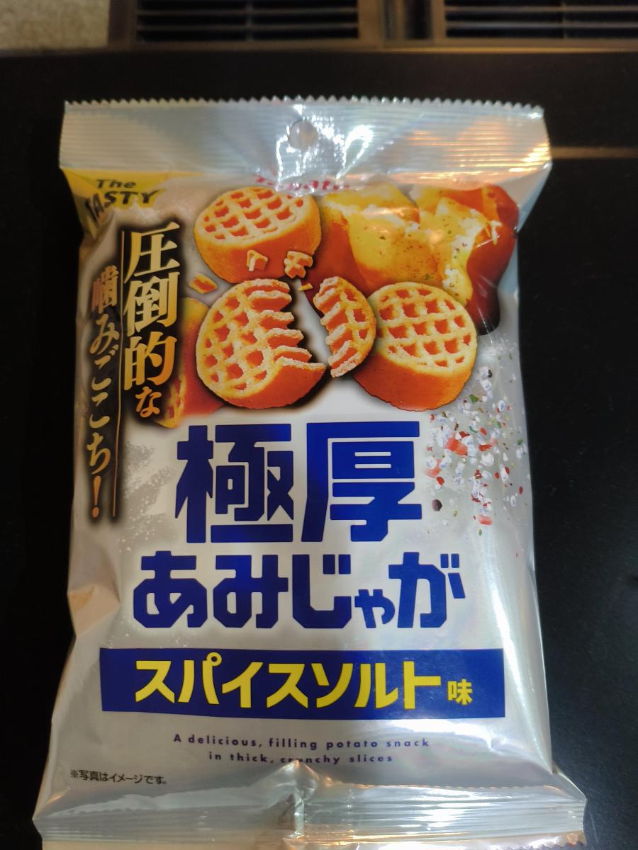 あみじゃがにスパイスソルト味と気になる味わいだったので購入してみました。極厚なので、1つがかなりの太めサイズ感で、ザクザクで噛み応えがたっぷりです。ブラックペッパー味より辛さは控えめで大変食べやすく、程よい塩気がいい塩梅で、やみつきになるような味わいで、大変美味しかったです。コスパもいいのでまた購入してみたいなと思いました。