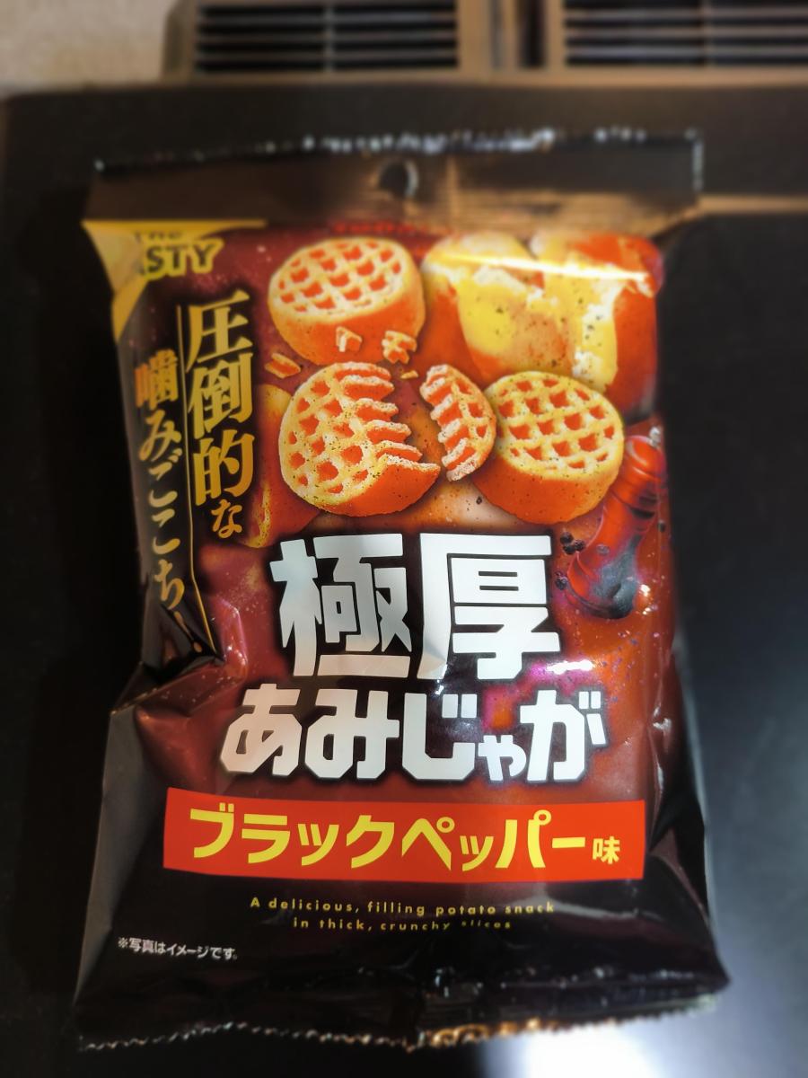 パッケージの色合いに目が惹きどんな味か試したく購入してみました。普段のあみじゃがより小ぶりで厚さは倍くらいあります。普段のあみじゃがと硬さは変わりませんが、厚みがあってかなりの食べ応えです。食べ進めるとピリッとした胡椒が後からきいてきて食べれば食べるほど美味しい味わいでした。コスパもいいのでまた購入してみたいなと思いました。