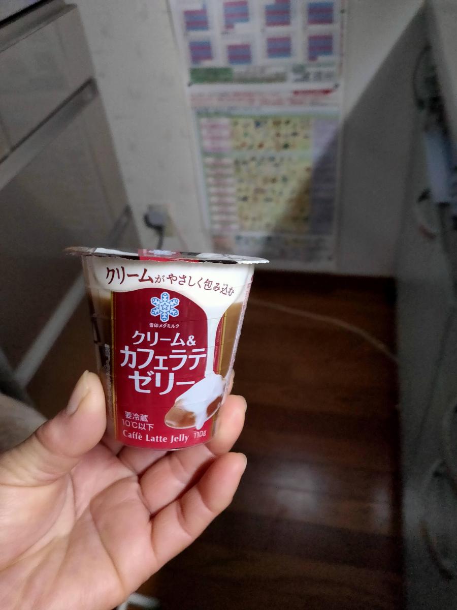 いつもは雪印のコーヒーゼリーの方を買っていましたが前から気になっていたのでこちらも買ってみました。コーヒーゼリーと比べカフェラテ味なので苦みが少なくマイルドな美味しさです。クリームがかかっており