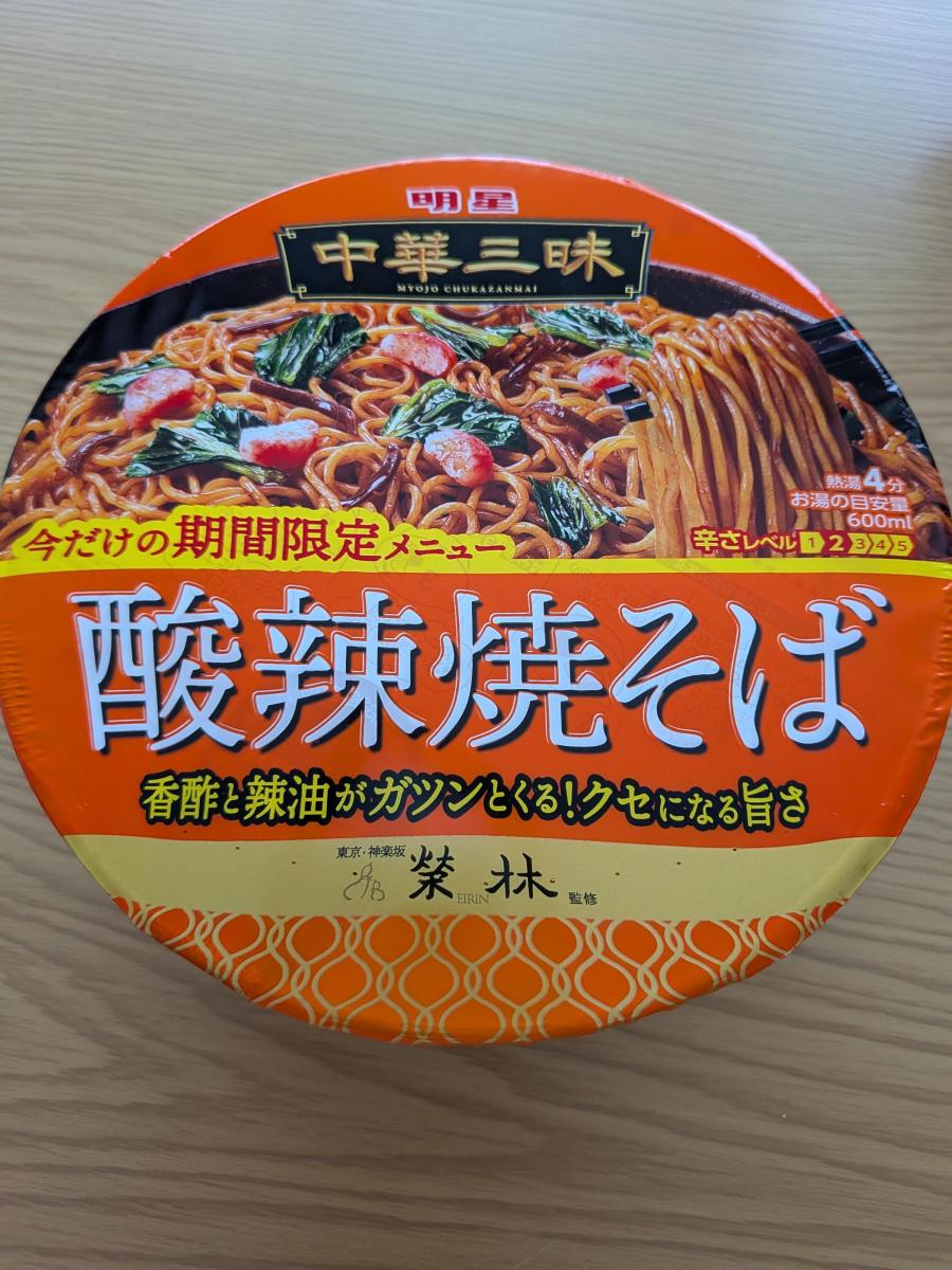 大好きな中華三昧シリーズで、サンラータン味の焼きそばだというので気になって購入してみました。麺がモチモチしていてとても良かったです。中華三昧シリーズはやはり麺のクオリティが高いです。具材は青菜、キクラゲ、肉のようなもの(練り物)が少々。お味は辛さはほどほどでしたが、香酢が効いていてほど良い酸味があり、うまみが強くておいしかったです。酸辣湯を食べやすくした味という感じでした。酸味も辛さも強くなく、やさしいすっぱ辛さで元気が出ました。