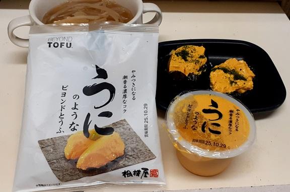 相模屋さんのビヨンドとうふのシリーズの一つです。 最近の物価高でなかなか雲丹なんて食べられなくなった時に 売り場で見つけて買ってみました。 雲丹用の薄口しょうゆを使って作られているので わさびだけでも美味しく食べられます。 かえって醤油は使わない方がいいかなとも思いました ご飯と海苔でウニの軍艦巻きをつくってみました。 生臭さは全くないので、青さをふりかけて、磯の風味を足して お味噌汁と一緒に。 魚醤・オキアミ・オイスターソースなどでこの味を 出しているのかなと後ろの成分を見て思いましたが。 ねだんも200円程度だったので気になる人にはおススメです。