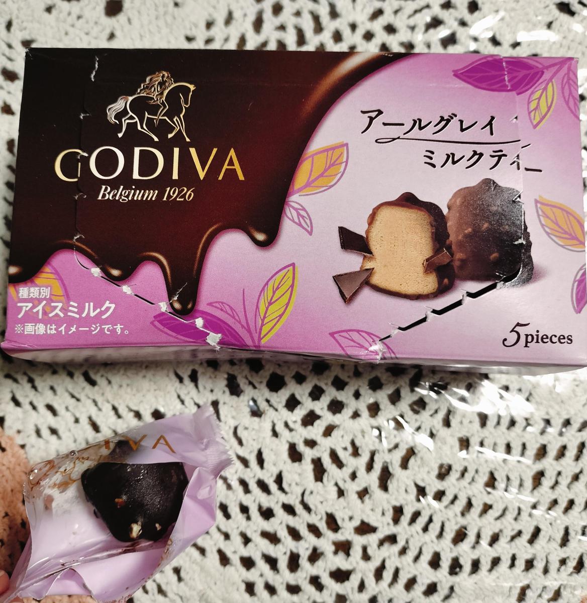 「ゴディバ ショコラフォンデュ アールグレイミルクティー」 以前食べたダークチョコレート味がおいしかったので、アールグレイミルクティー味も買ってみましたです。1箱に5個入りです。トレーに載っているタイプではなく、一つずつ個包装になっています。 簡単にいうとアールグレイミルクティーアイスをローストアーモンド入りのダークチョコレートでコーティングしたアイスです。カリッとした硬めのチョコの食感のあと、アールグレイミルクティーの味がふわっと広がります。 アーモンドの食感や風味がアールグレイの香りと合うのかな?と思いましたが、香り高いアールグレイの茶葉の香りとアーモンドの香ばしさとほろ苦いチョコのバランスが良かったです。ミルクティーが甘すぎず、すっきりとしています。アールグレイの茶葉の余韻が長く続いて、もちろん熱い紅茶との相性も最高でした!贅沢な時間を過ごすことが出来て、幸せでした。 まだ暑い日も寒い日もある10月の夜におすすめなアイスです。