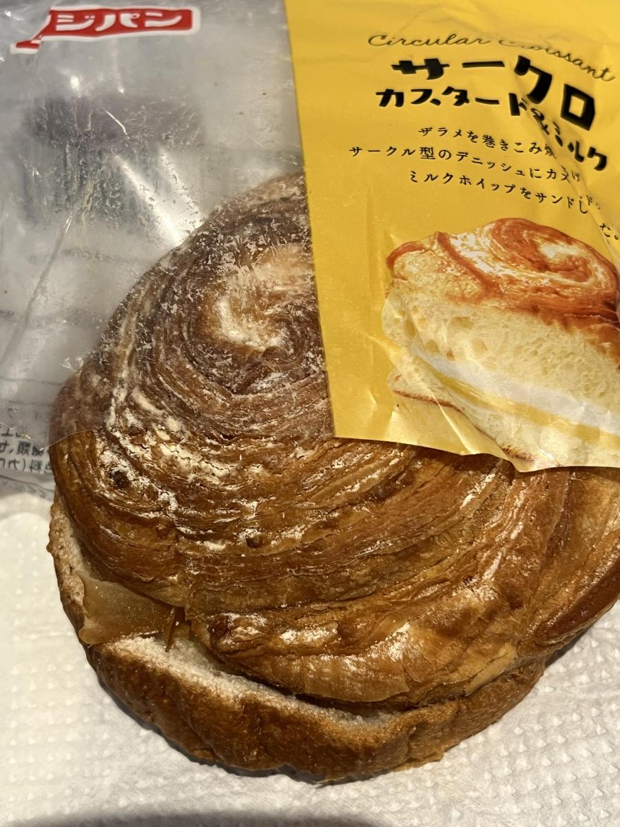 デニッシュとあるけれど結構独特なパン生地で、デニッシュの軽さと普通のパンのずっしりとした食感が一緒になっている。そのパン生地に粉砂糖がまぶされていて、カスタードとホイップクリームが入っているということで、味のイメージはまさにシュークリームといったところ。そのシュークリーム感には、デニッシュ的なパン生地部分の食感がシュー皮風にも感じられるというところももちろんあるわけで、イメージよりもずっとスイーツ感があるのが特徴かなと思える。サークロというネーミングは正直?な気はするけれど、パッケージそのもののデザインもどこかスイーツ的だし、そういうイメージで購入すればいいパンかなと思った。