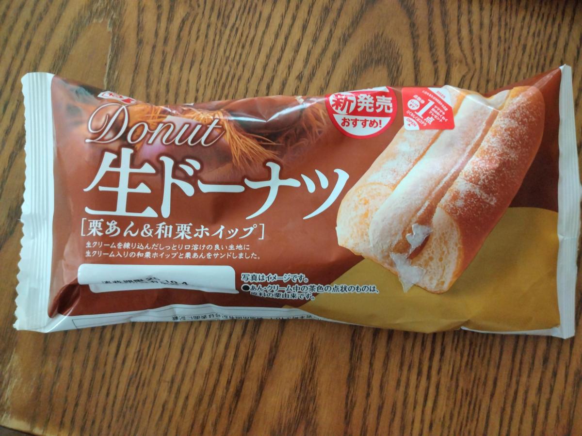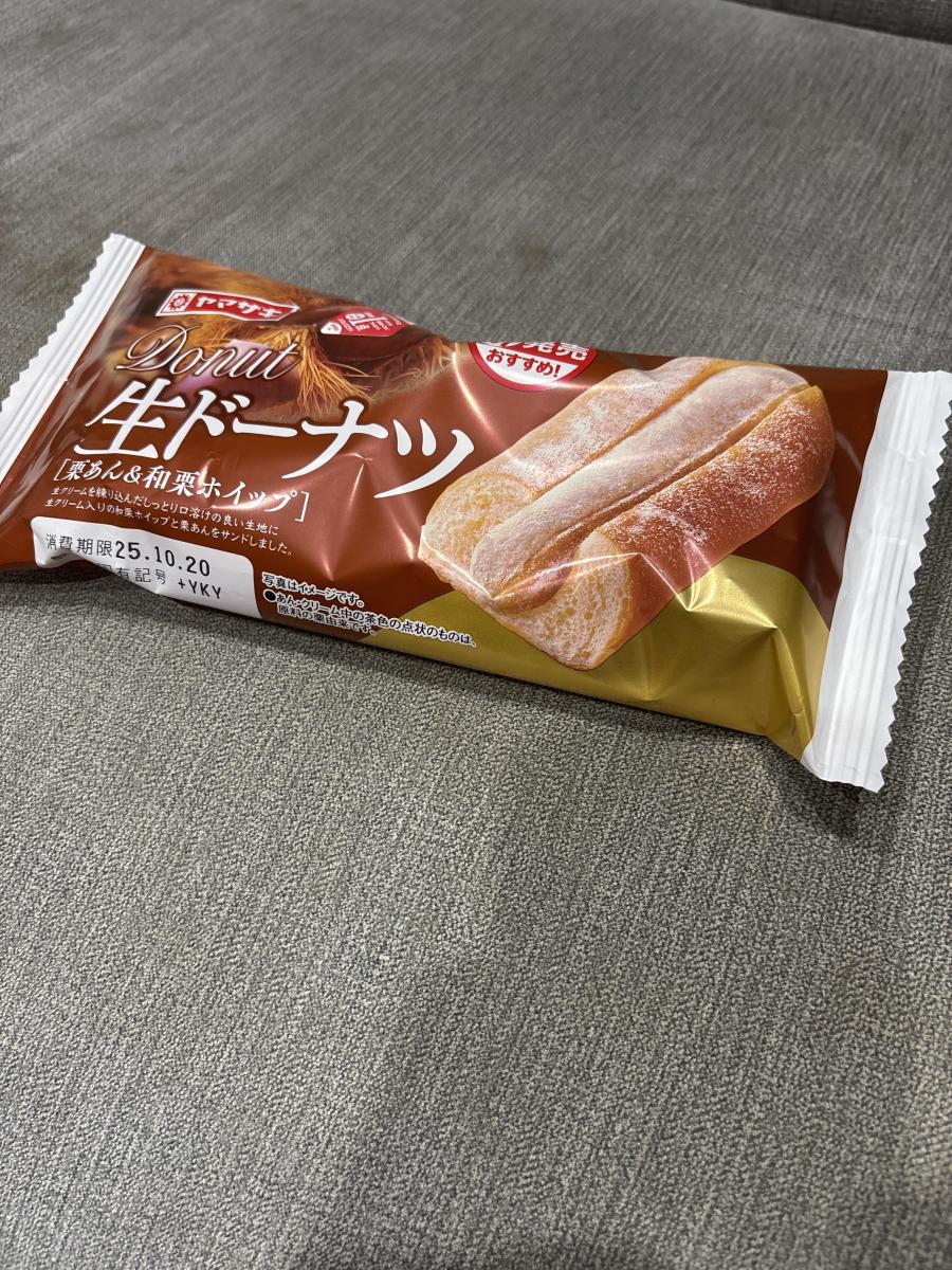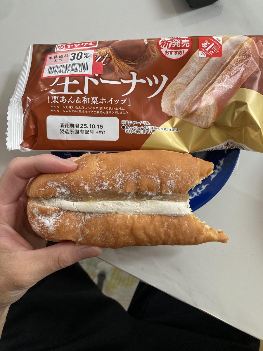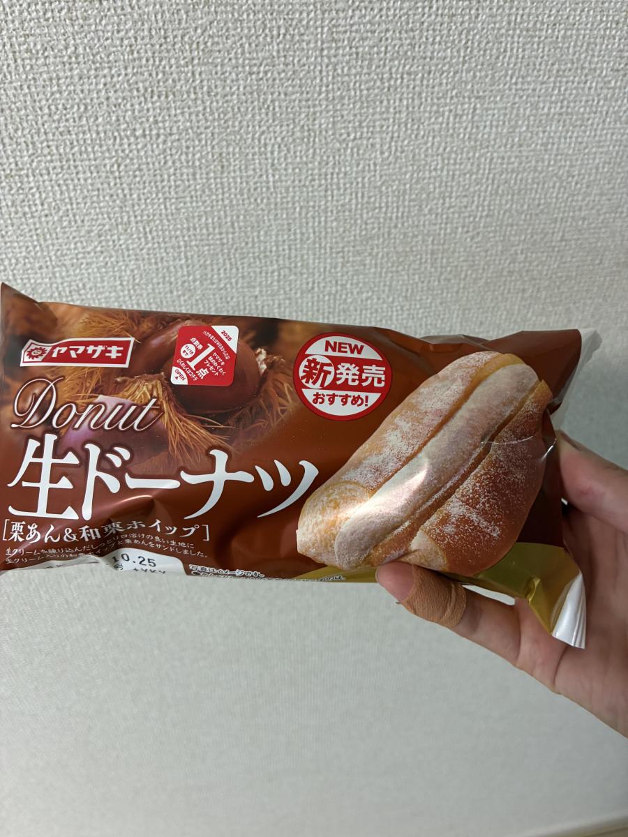 生ドーナツに栗あん&和栗ホイップ味と何とも美味しそうなネーミングに惹かれてどんな味か試したく購入してみました。粉砂糖がたっぷりかかったドーナツはしっとりしつつも、ややむちっとしており、まさしく生な食感でした。栗あんは白あんベースのざらっとした質感で、和栗ホイップは油脂感なく栗あんと生地の馴染みをよくしてくれていて、バランスがよく食べやすい味わいでした。コスパもいいのでまた購入してみたいなと思いました。