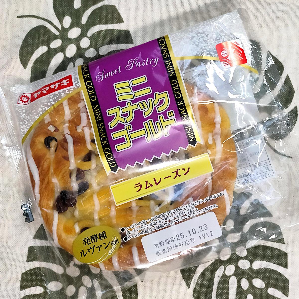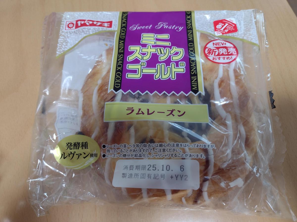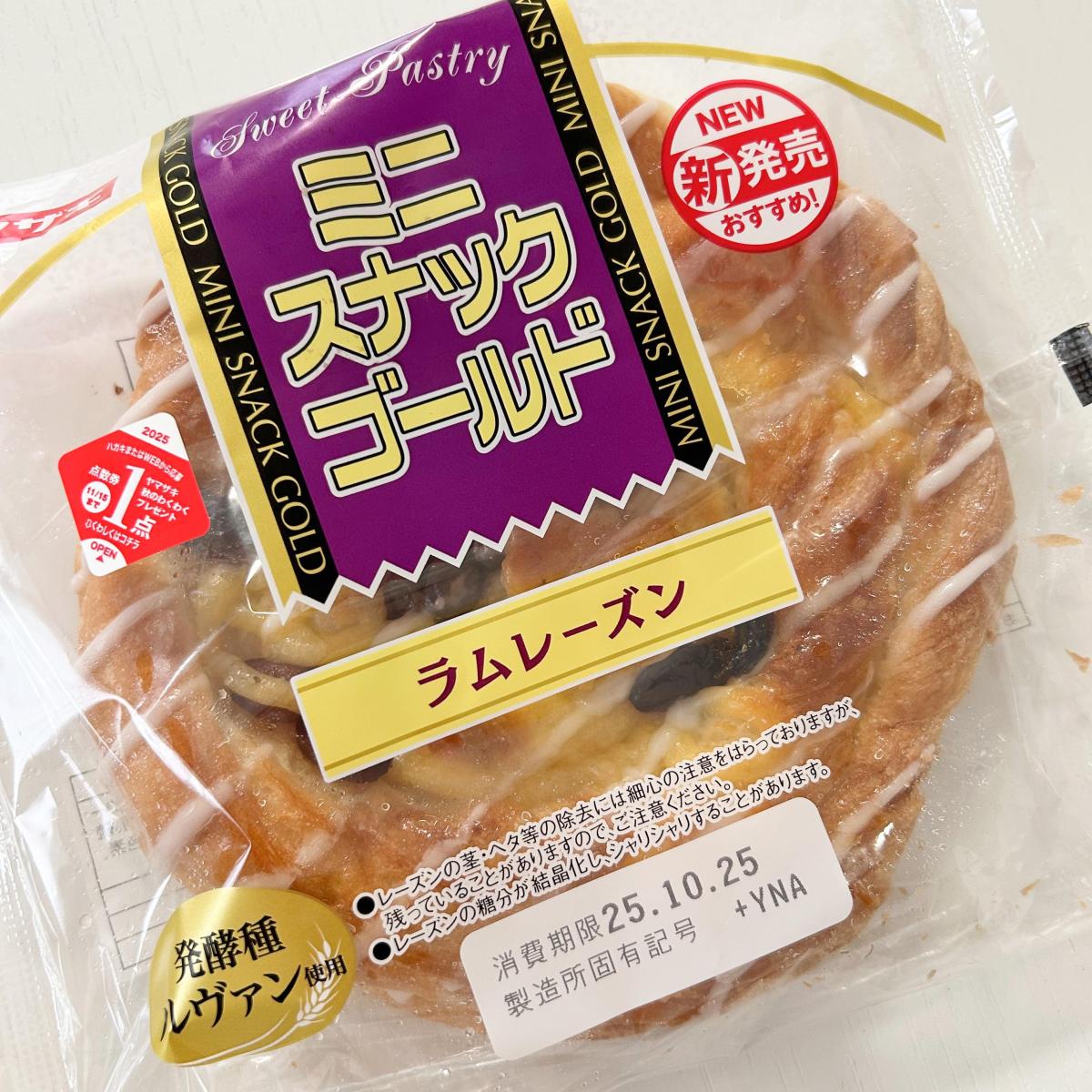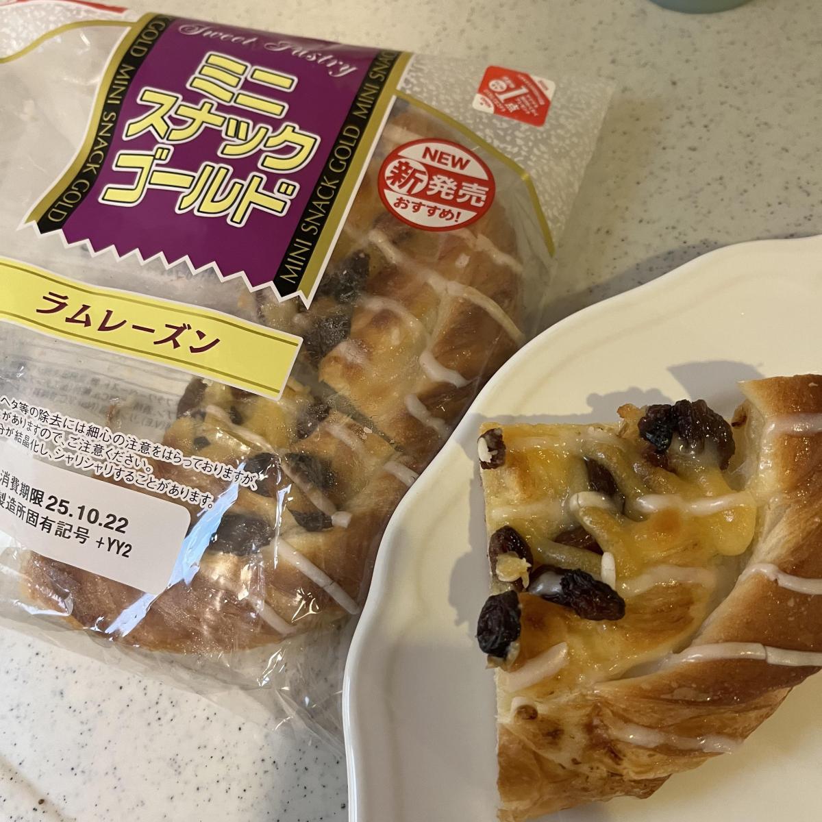 ミニスナックゴールド大好きな私。新商品が出でたのでレビューさせていただきます。ラムレーズンという響きが、とっても大人ですね。今まで限定品って、生地に練り込んであるような感じで一体感がありましたが、こちらは生地に練り込むタイプではなくラムレーズンがパラパラと生地の上にのっています。真ん中辺りはケーキかクッキー生地がのせてあるのかな?いつもと違う趣きです。スナックゴールドには欠かせない、白いアイシングがシャーッとかかっております。絶対これは外せないです!!いつもはトースターで焼いて食べるのですが、今回はレーズン焦げたら悲しいのでそのままいただきました。しっとりしたデニッシュ生地にふっくらしたレーズンの甘酸っぱさと食感がアクセントになっております。レーズンのばら撒き方が色々あるようで個性が出でます。今回、私は一部にレーズンが片寄ってるタイプを選びました。真ん中あたりのしっとりケーキ生地あたりになると、ちょっと違う味わいが楽しめます。いつもと違う雰囲気なので、ちよっと驚きもありましたが、疲れた体にはこの甘さが嬉しく美味しくいたけました。なんか今回はお上品な感じで、ガツーンとくるあの感じが緩和されてる気がしました。やっぱりカロリー高いけど美味しいのでまた買います。