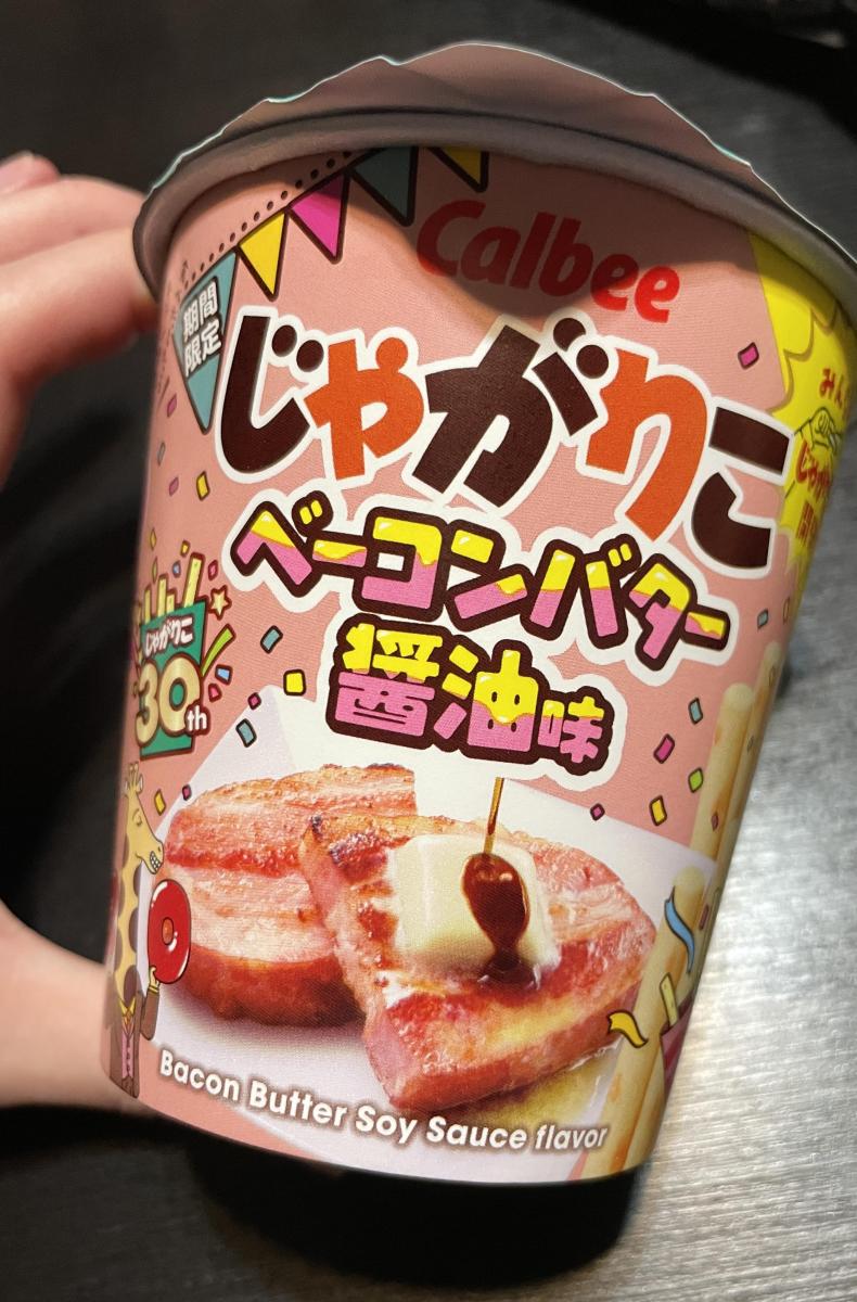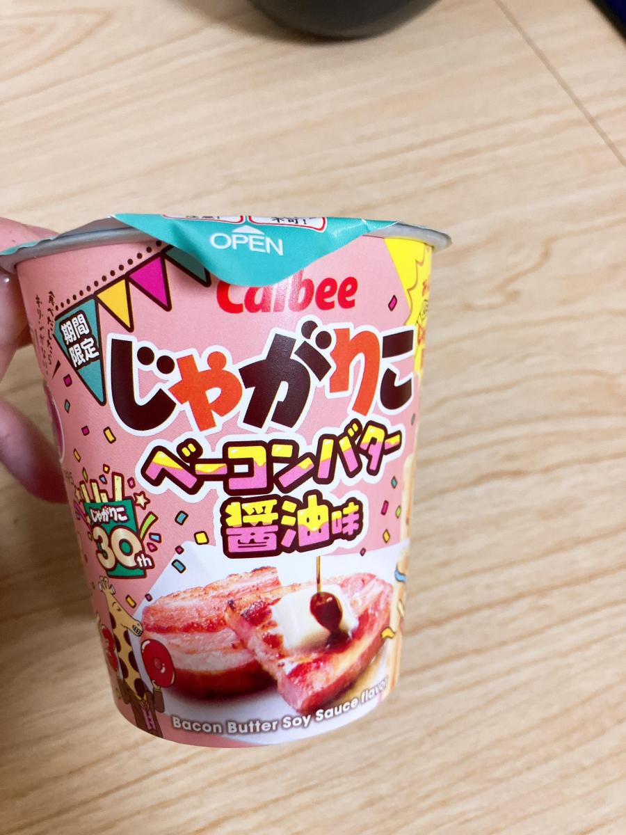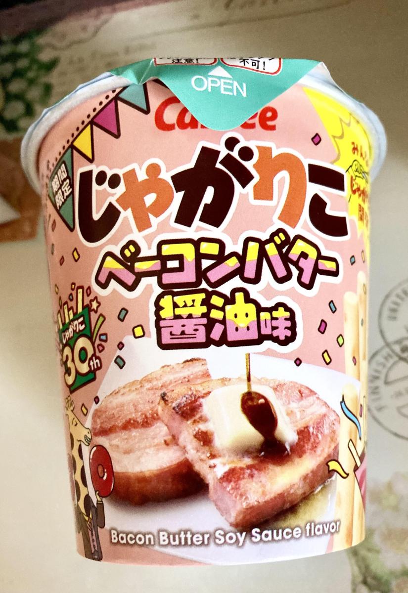 何だかいつもと違うかわいいパッケージに目が惹きベーコンバター醤油味がどんなのか試したくなり購入してみました。フタ開けた瞬間からベーコンの香ばしい香りがただよい食欲がそそります。じゃがりこのサクサク感はそのままで美味しくてやみつきになります。バター醤油ですが、何だかにんにくの風味がガツンときて少しバター醤油が薄れていたのが残念でした。