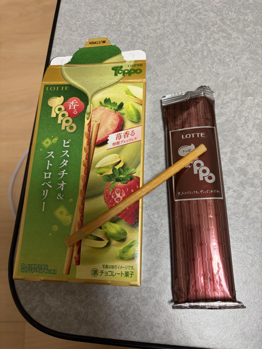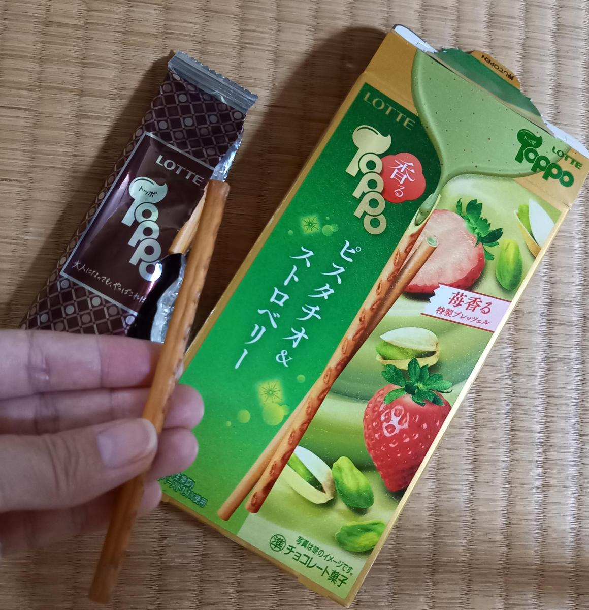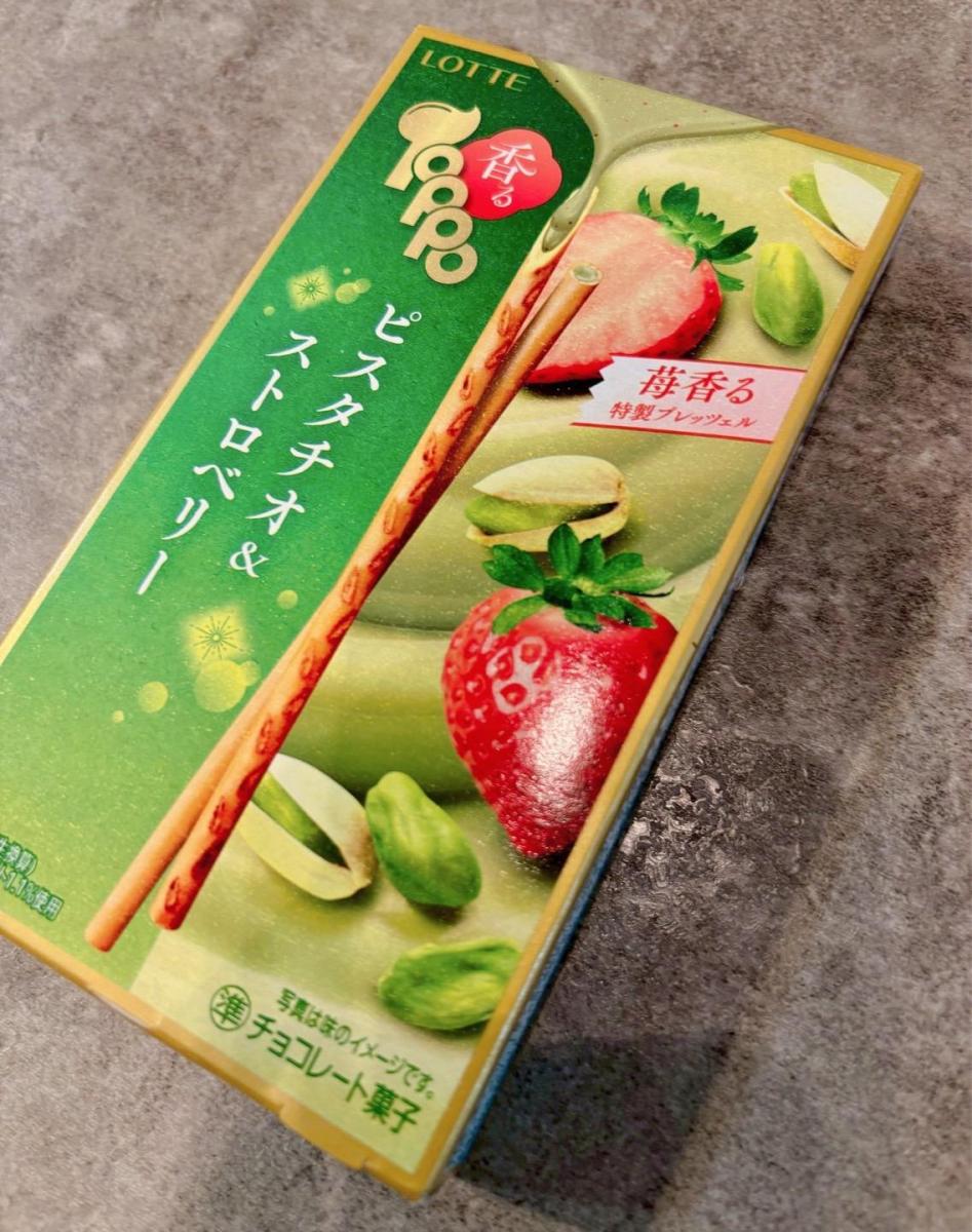 ロッテのトッポ チョコレートピスタチオ&ストロベリー味を食べました。香ばしいピスタチオのコクと、甘酸っぱいストロベリーがバランス良く、サクサク食感とも相性抜群です。後味も軽く、つい手が伸びる美味しさです。