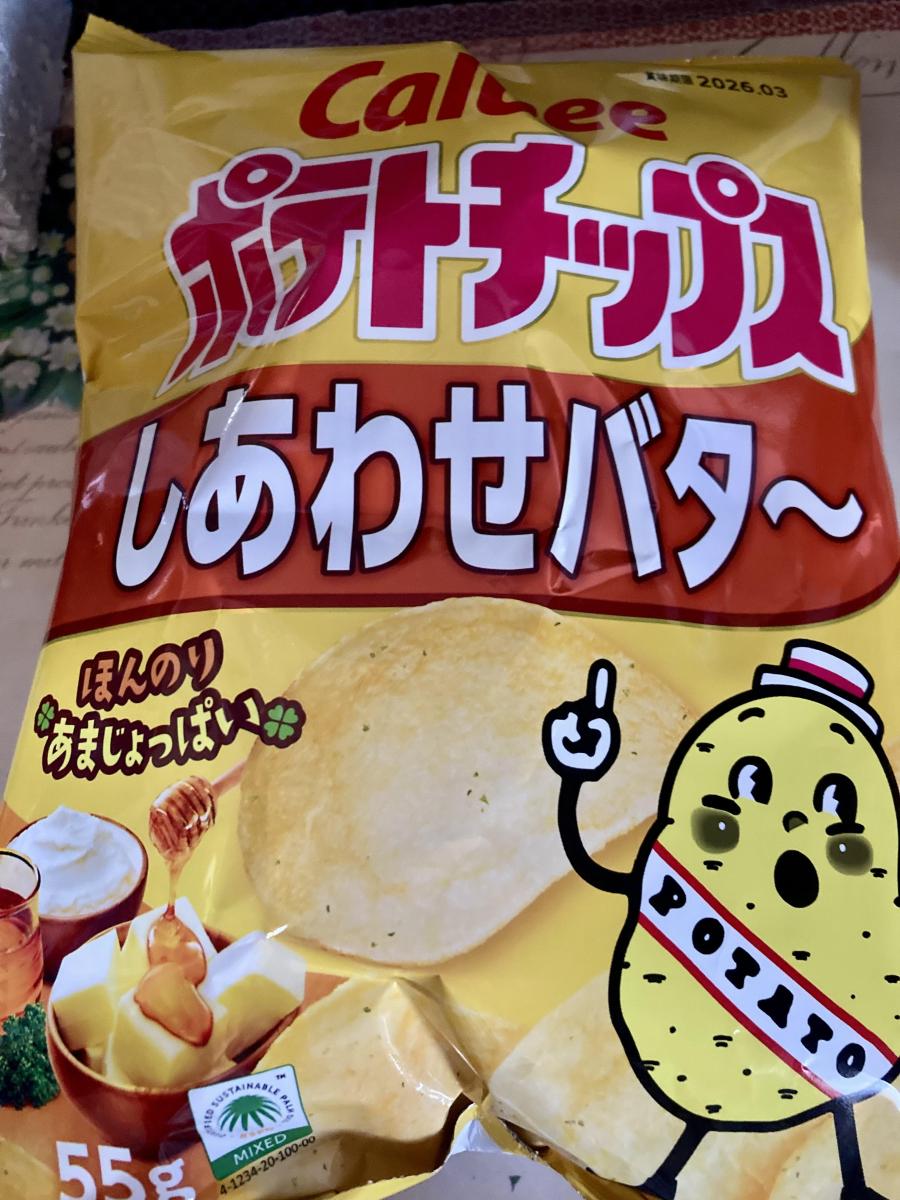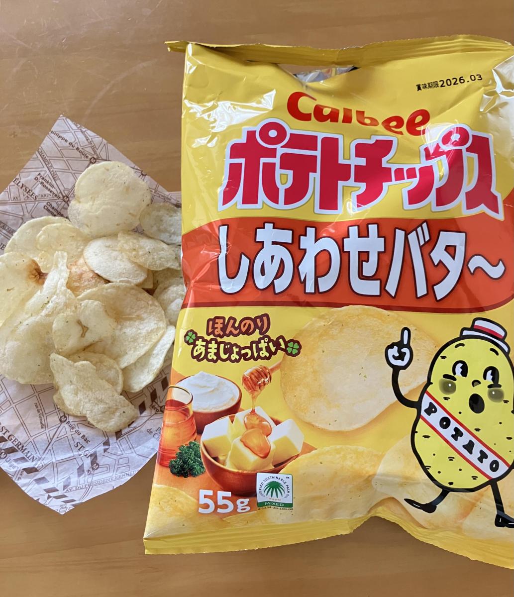 しあわせバタ~のネーミングに惹かれて購入してみました。袋開けるとバターの香りが食欲がそそります。チップスはいつも通り薄めですが、サクサク食感は変わらずでいい食感です。味は、バターの風味にはちみつの優しい甘さ、そこに塩が加わる事でやめられない中毒性のあるやみつきな味わいで大変美味しかったです。