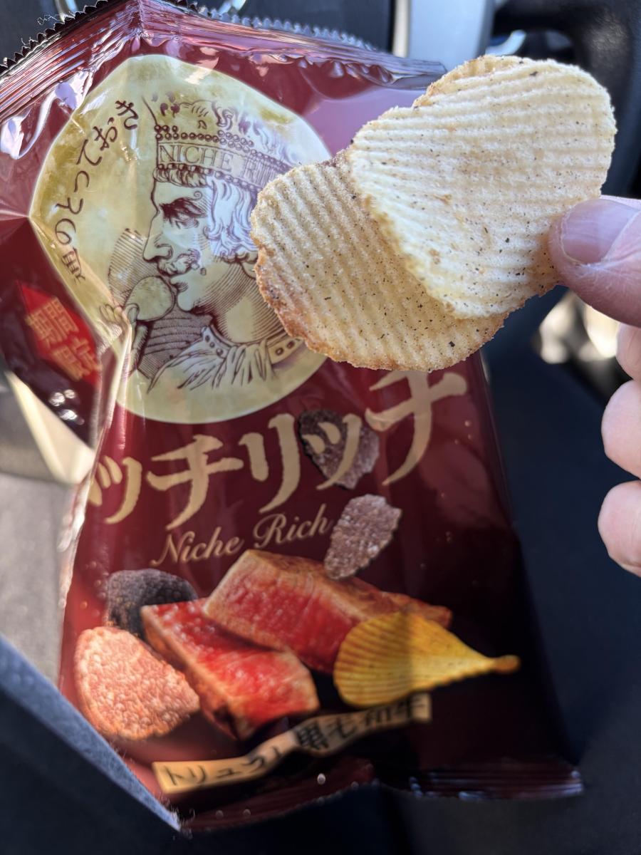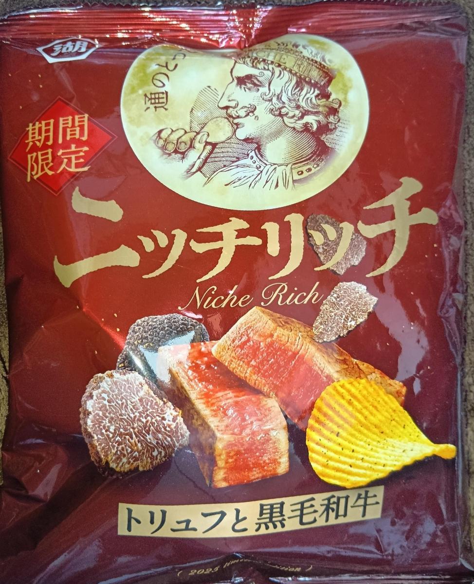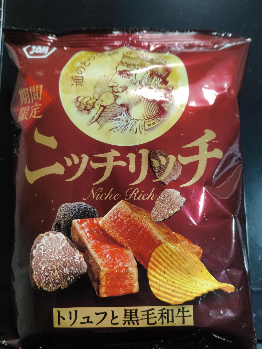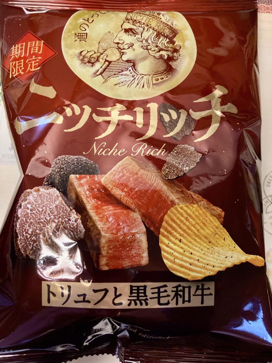 ニッチリッチと何とも高級そうなネーミングとパッケージに惹かれて購入してみました。袋開けるとすぐにふわっとトリュフの香りがたっぷりとただよいました。ポテトチップはギザギザで噛み応えあるチップスで食べると和牛の香ばしさとしょうゆの香り濃厚なトリュフと塩気がたっぷりと感じました。イカスミやチーズも入っているそうで塩味がやや強めでしたがやみつきになるような大変美味しい味わいでした。