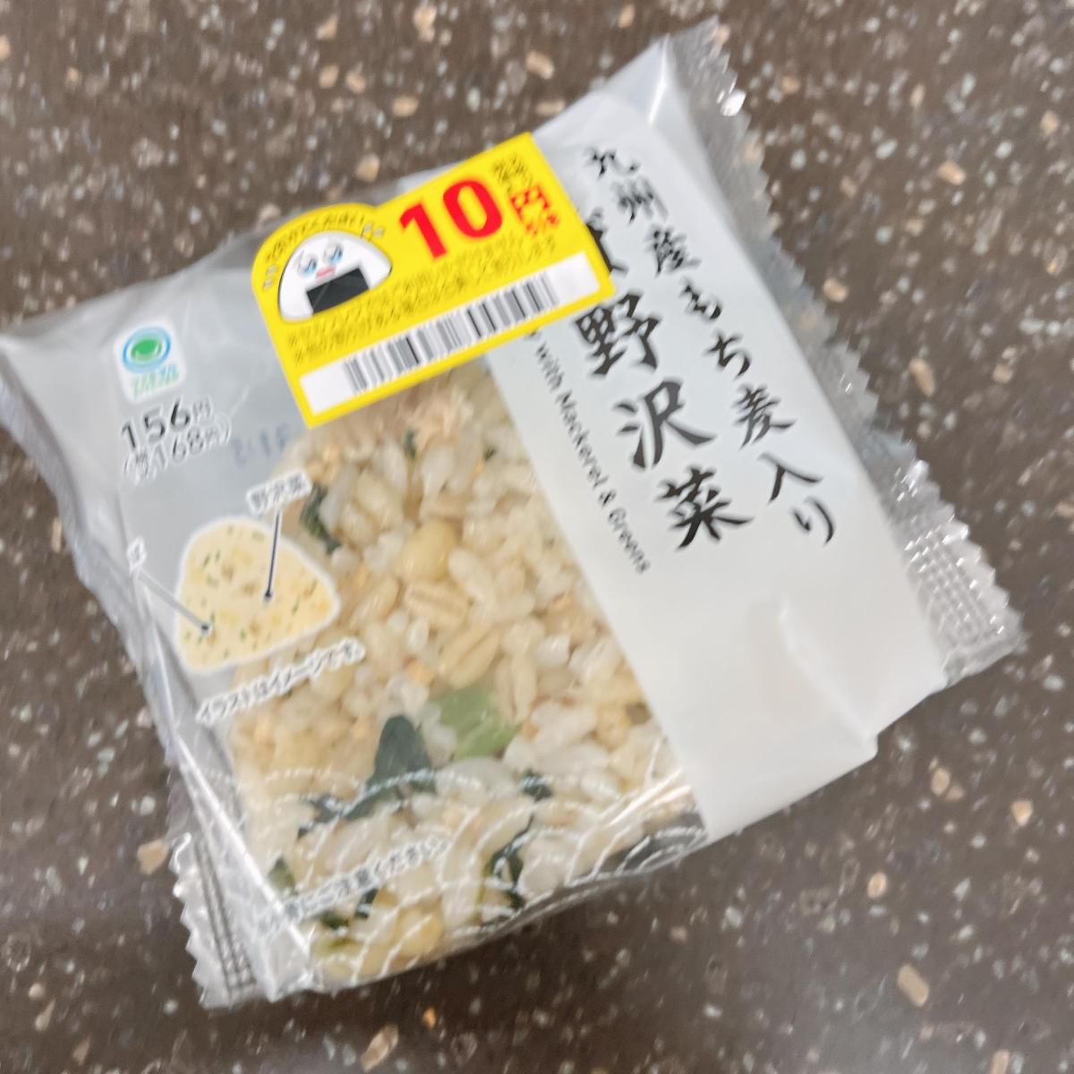 九州産のもち麦入りごはんにさばのほぐし身と野沢菜が混ぜこまれた健康的なおにぎり。