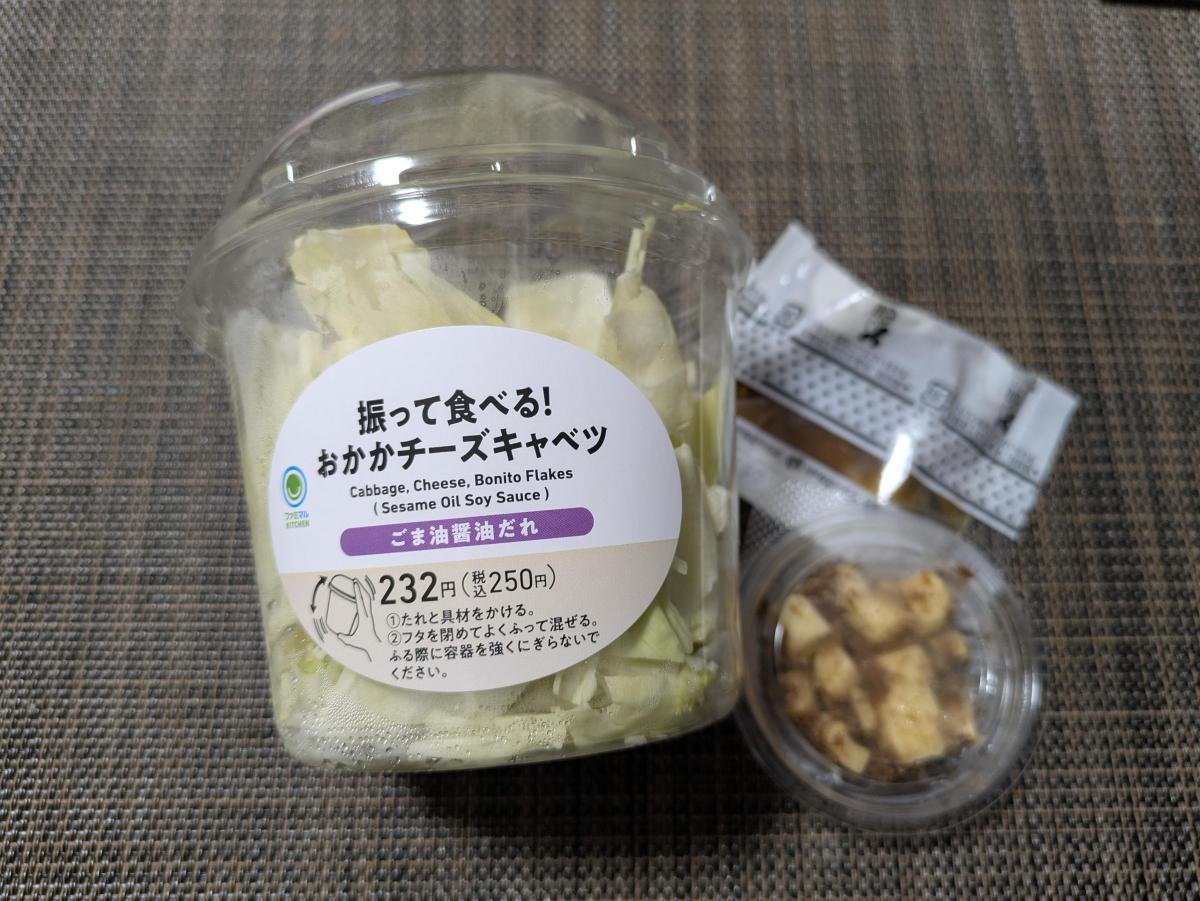 キャベツにおかかとプロセスチーズ和え、さらにごま油醤油ダレを和えて食べるおつまみ仕立てのキャベツ。居酒屋さんみたいだし、自分で振って仕上げる楽しいおいしさ。 シンプルな材料だけど税込250円とお値段高め… ごま醤油ダレは香ばしいおつまみ仕立ての味わい。 結構塩分濃いめでキャベツと相性良い。シャキシャキ食感で硬すぎずみずみずしい。 おかかとプロセスチーズは混ぜちゃうとおかか味になっちゃうから、最初から一緒に混ぜずに上に乗せるくらいの方が良いかも。チーズは硬めのプロセスで旨みたっぷり、お弁当のおかかみたいな味。 結構味濃いめだからおつまみにぴったり。 食べ応えもあって満足感が高かった。