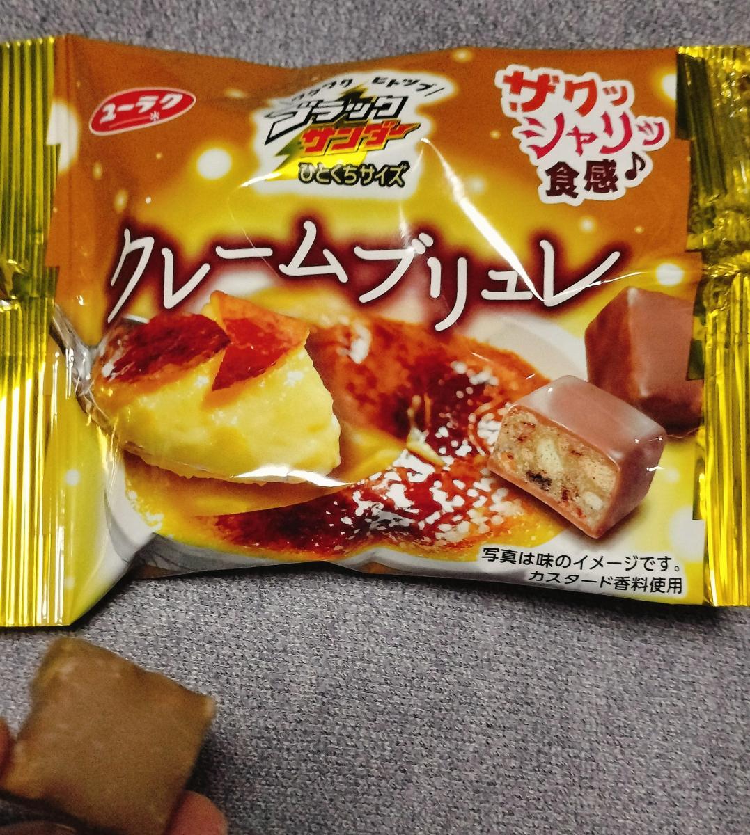キャラメルの粒?が入っていて、クレームブリュレの上のカラメル部分のパリッシャリッ食感が再現されている感じ!クリーミーなチョコレートにサクサクビスケットとシャリっとキャラメル、全部が合わさって一粒満足度がすごいブラックサンダーでした。