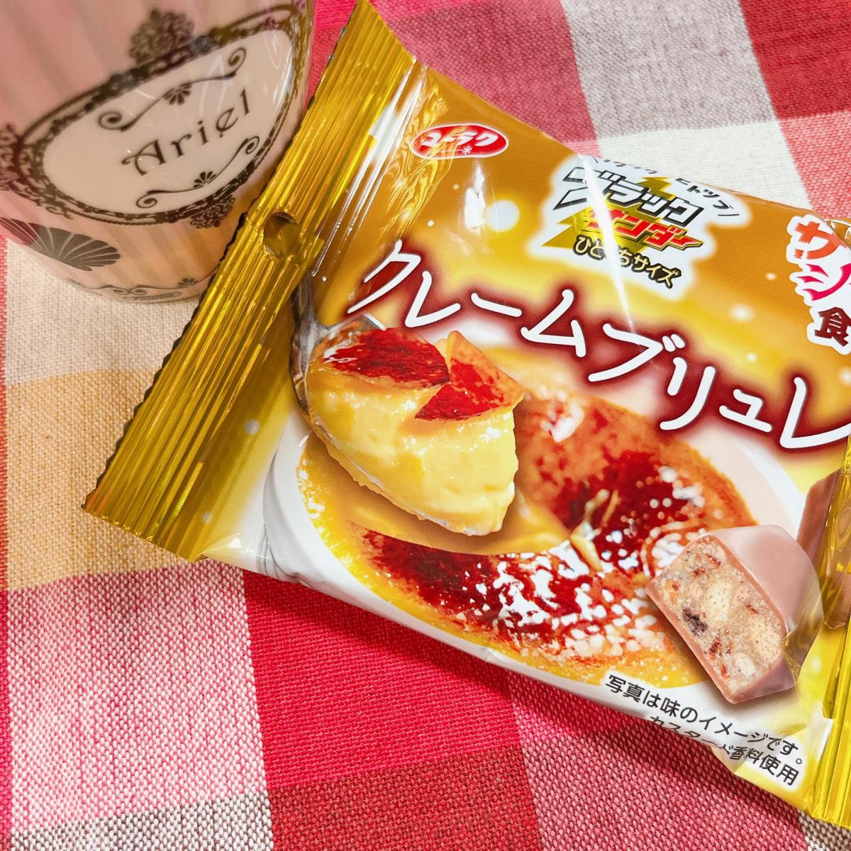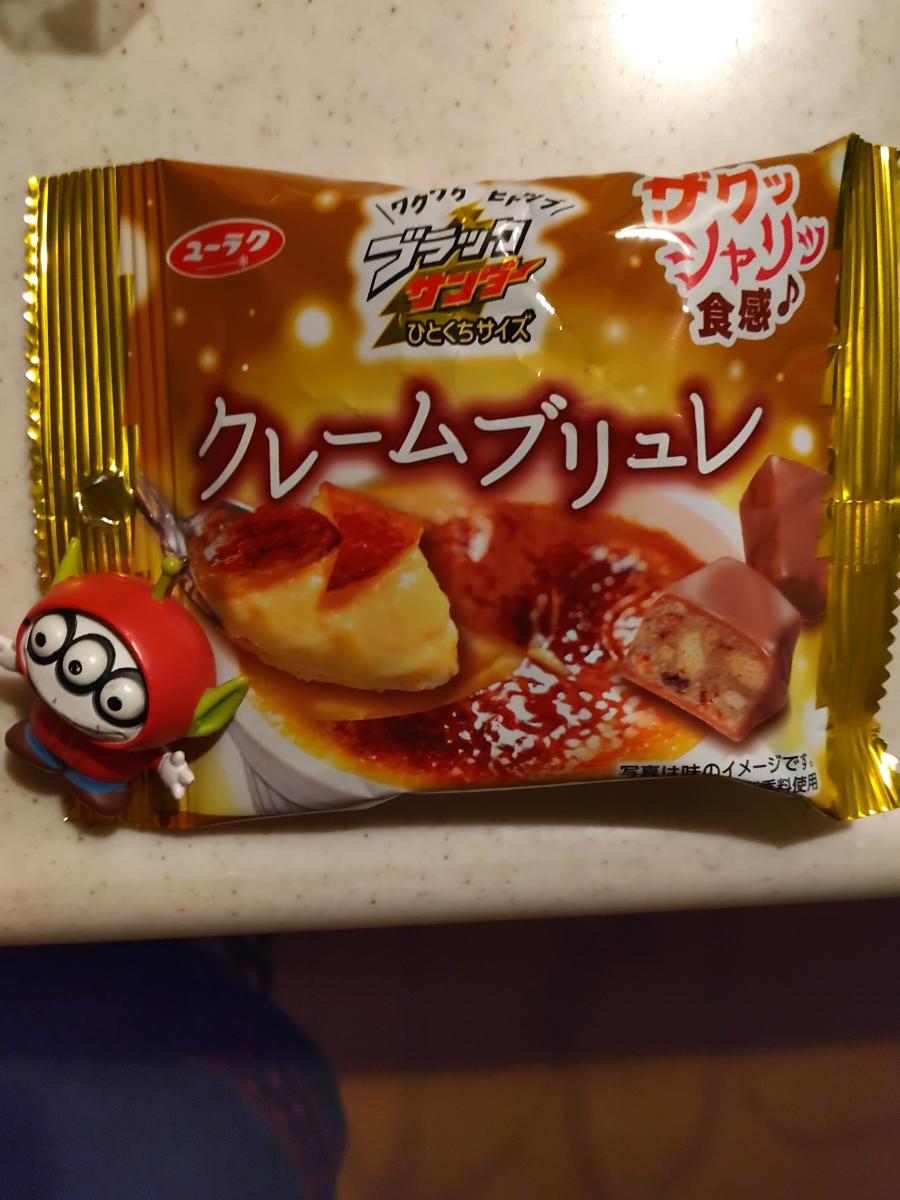 表面がパリパリのプリンが好きなので、パッケージのイラストに一目惚れしました。コンビニ限定商品です。一口サイズのブラックサンダーが1袋に7個入っていました。中にビスケットとカスタードパウダーとカラメルチップが入っているため、噛むほどにザクッ、シャリッとした食感が変わるところがおもしろかったです。チョコはまろやかでコクがあり、カスタードと香ばしいカラメルソースの味が甘く、1個で高級感がありました。温かい紅茶やコーヒーとまた一緒に食べたいので、リピートしたいです。