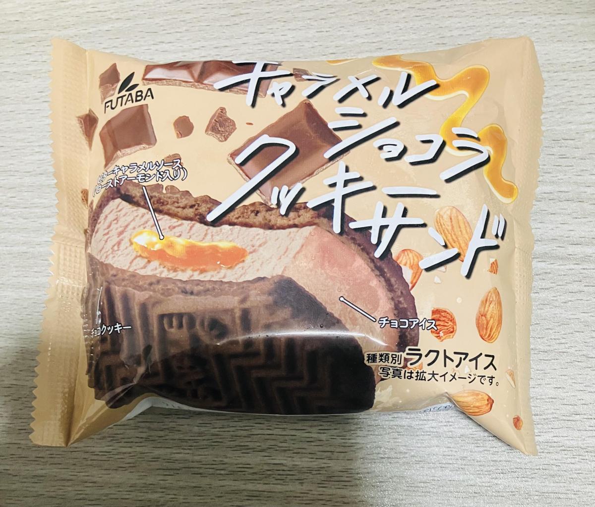 ショコラクッキーサンドのネーミングに惹かれてどんな味か試したく購入してみました。外側のチョコクッキーはしっとりほろほろ、ほんのりほろ苦いチョコ風味で、少し塩味を感じる甘香ばしい生地が大変美味しいです。チョコアイスはすっきりした甘さでビター感のある、ミルキーなチョコ風味アイスで、大変好みな味わいでした。ビターキャラメルソースはとろっとなめらかで、バターの風味を感じる甘めなキャラメルの味わいがアイスと相性がいいです。細かく砕かれたアーモンドの食感もアクセントでいいです。