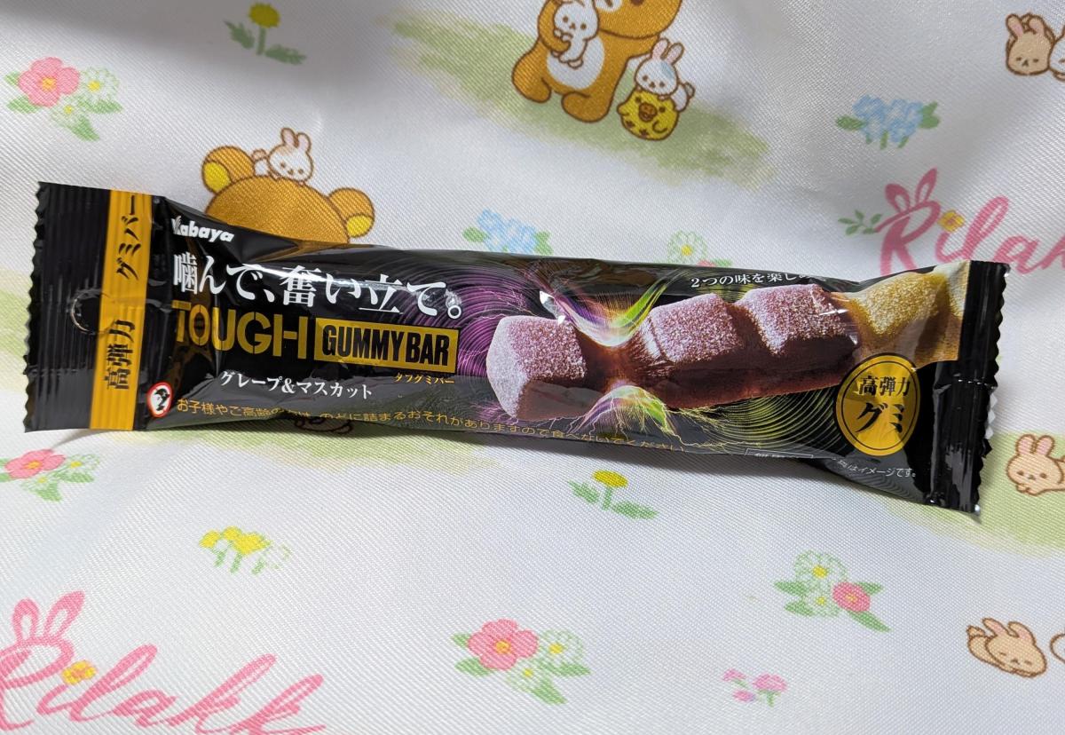 タフグミ BARとなんとも珍しい形が気になり購入してみました。緑のマスカットと紫のグレープが真ん中で繋がっている何とも珍しい形のグミです。かなり一生懸命噛み切らなければいけないハードグミ食感で、噛む力が結構いります。グレープとマスカット味は、噛めば噛むほどジューシさーを感じ、そこまで酸味が強く感じなかったので、食べやすい味わいです。