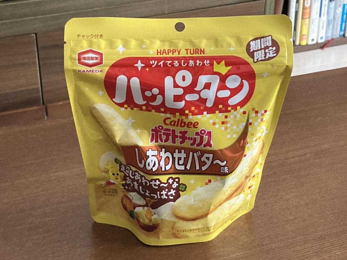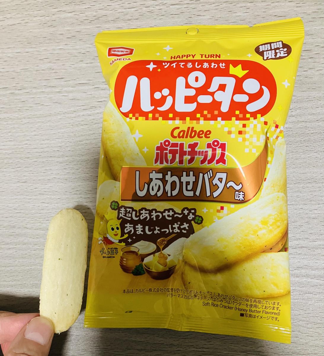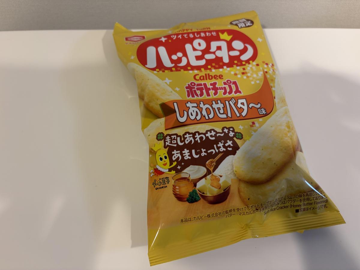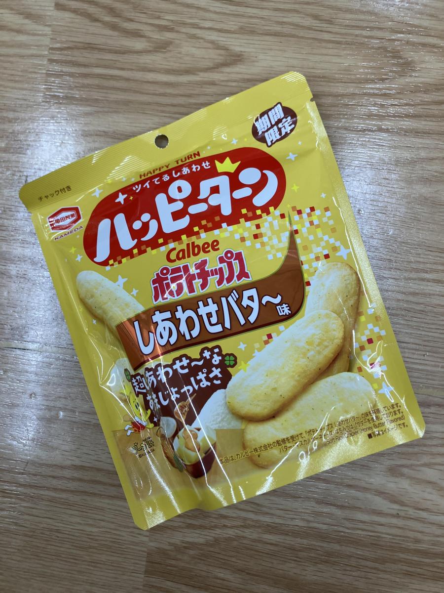 なんとポテトチップのまろやかバター風のハッピーターン。まろやかなバターパウダーがすごくおいしい!両方ともコラボしてるのも面白いし、両方おいしくてハッピーでした。