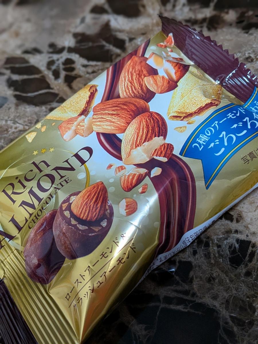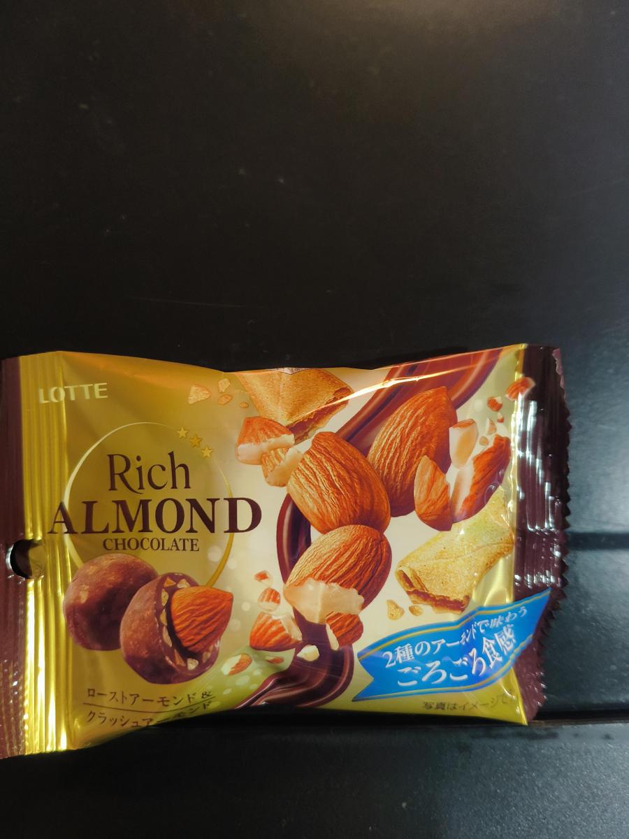 リッチアーモンドチョコレートのネーミングとパッケージに惹かれて購入してみました。表面はマットでクラッシュアーモンドが散りばめられていました。食感は硬めでアーモンドの香ばしさと食感が大変いいです。チョコレートは甘さがありますが、アーモンドの香ばしさと合わさって大変食べやすかったですが、リッチ感はあまりよくわからなかったです。