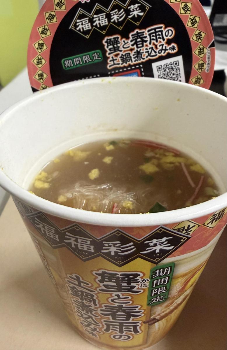 土鍋煮込み味ということで、確かに煮込み料理のような落ち着いた味わいがありました。カニの風味はそこそこ感じられますが、はっきりとした味わいを楽しむという感じでもなかったなと思います。春雨の量は多く食べ応えがありましたが、それほど主張の強くない味と香りだと感じました。寒い日にゆっくり楽しむ味の印象ですね。