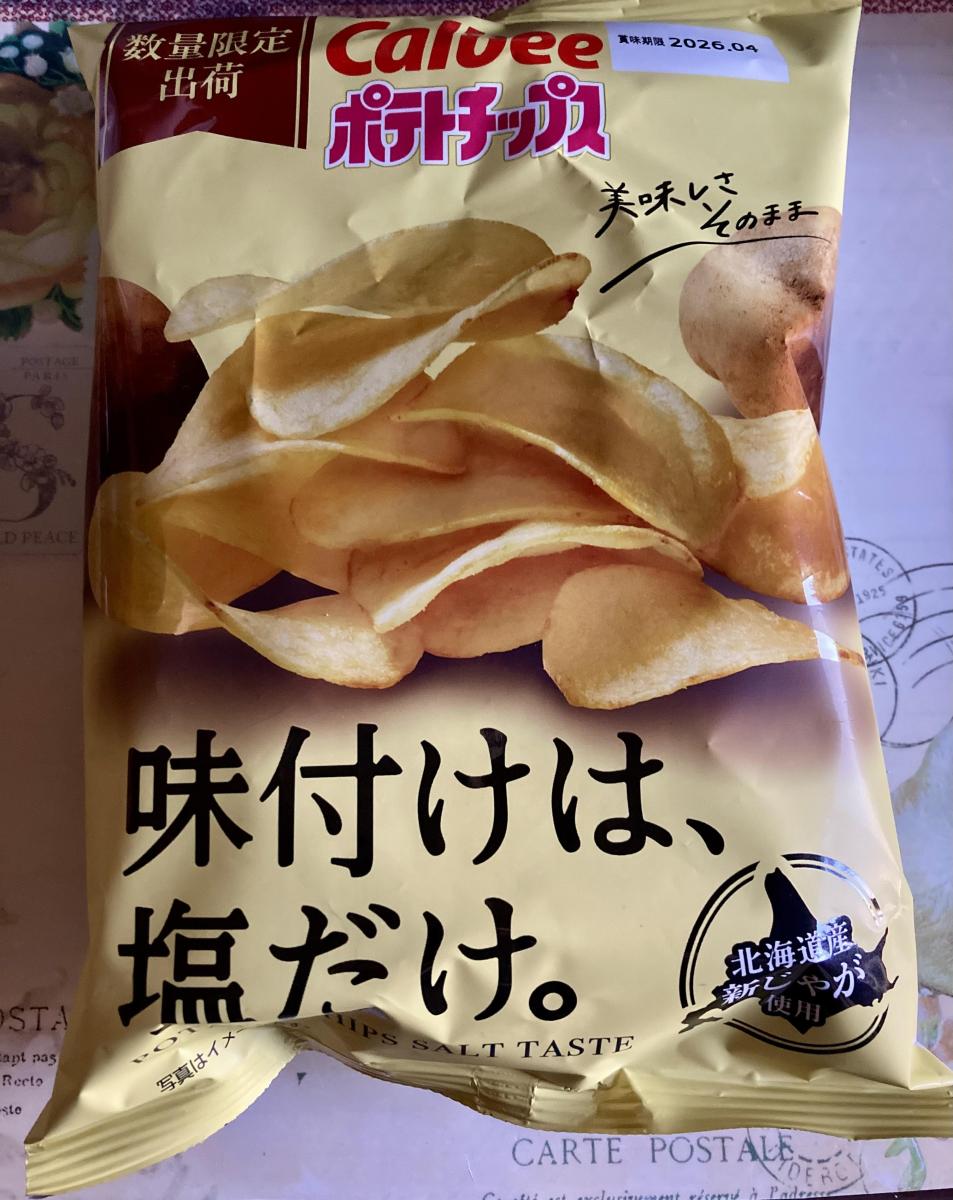 味付けは、塩だけのネーミングに惹かれてどんな味か試したく購入してみました。パリパリッとした手触りの薄めのポテトチップスで、色合いも香りもシンプルです。味わいは超シンプルですが、とてもおいしい。商品記載の説明通り、濃いめの味付けがない分、じゃがいものおいしさが際立っていて大変食べやすいです。じゃがいも好きにはぴったりです。軽めの食感なのでサクサクッと食べられて、手が止まりません。限定ではなく、定番化してほしいです。