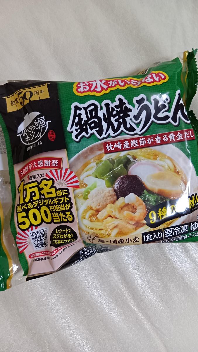 見た目にも具だくさんでおいしそうに見えるが、その期待を裏切らない満足度の高い商品だと思った。まず麺がよくて鍋焼きうどんというとやわらかめのグニャとした麺の場合も多いけど、これはものすごく弾力があるのがGOOD。讃岐うどん的なコシとはまた違う弾力という感じで、これが鍋焼きうどんにはよくマッチしている。具材もどれも本当に工夫が行き届いていて、エビとかつくね団子が入っているのはやっぱり嬉しいのだけど、一番良かったのがしいたけ。甘めの味付けがされていて、これがしっかりと味が染みこんだ、老舗のうどん屋さんで鍋焼きうどんを食べているような気分にさせてくれる。この具だくさんから色んな味がだしに溶けこんでいてスープの方も文句ナシ。値段以上の満足感が得られるのは間違いなくて、ここに生卵をひとつ落として食べるのが最高の食べ方なんじゃないかなと思った。