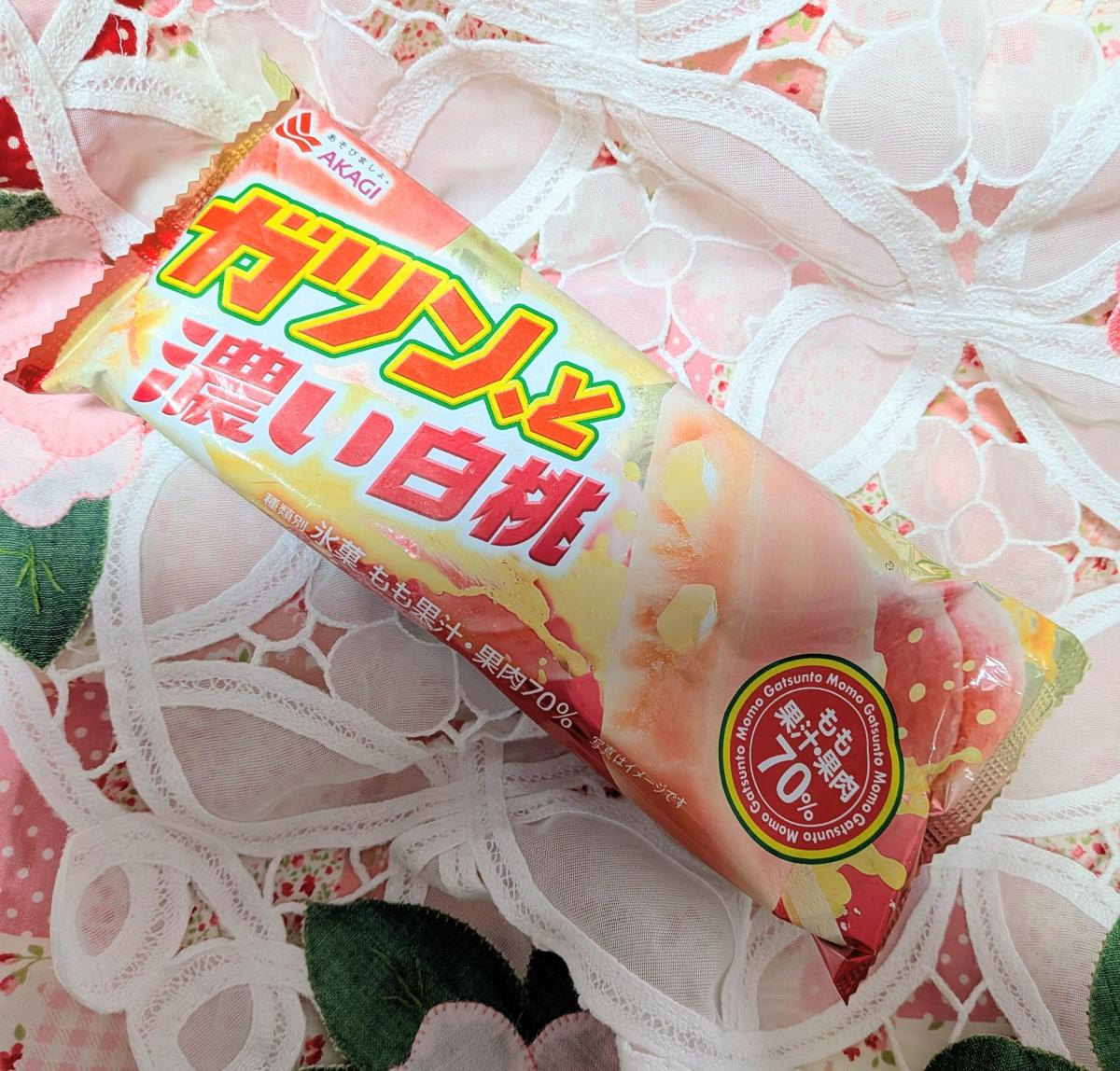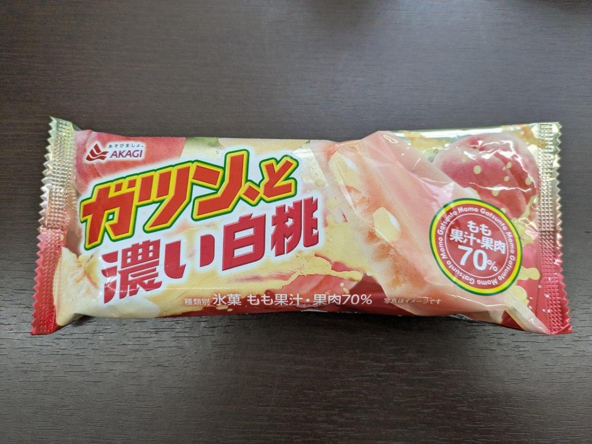 ガツン、とシリーズらしく、果実の食感がしっかり感じられるおいしい桃味のアイスです。