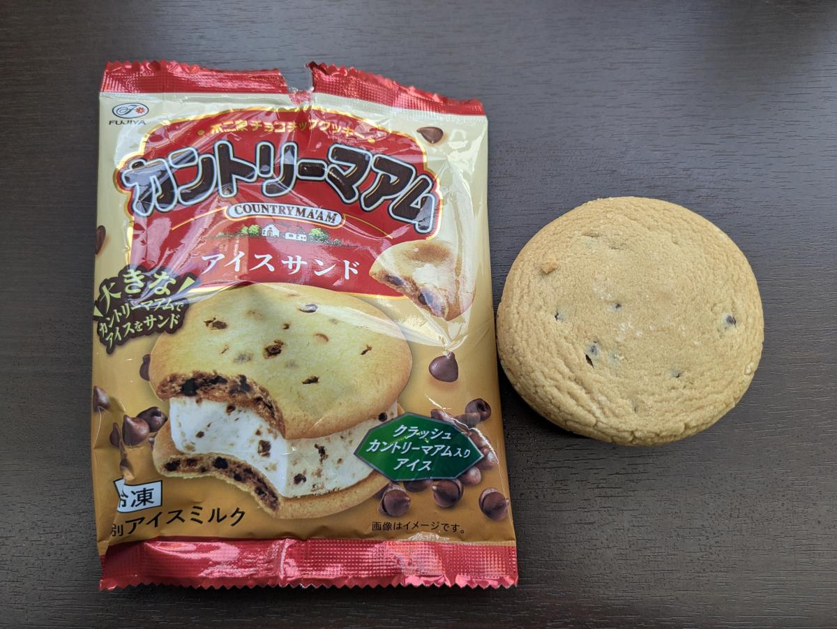いつもより大きいカントリーマアムにサンドされたカントリーマアムアイス。サンドアイスもカントリーマアム仕立てで、クラッシュクッキーが入ってる贅沢さ。