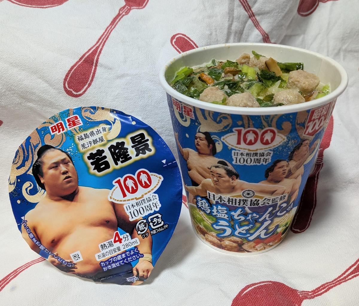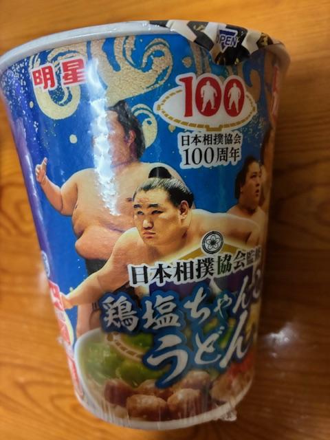 青い色のカップは、鶏塩ちゃんこ味のうどんでした。お相撲さんの写真が付いていて、お相撲ファンとしては、試してみたい衝動にかられました。