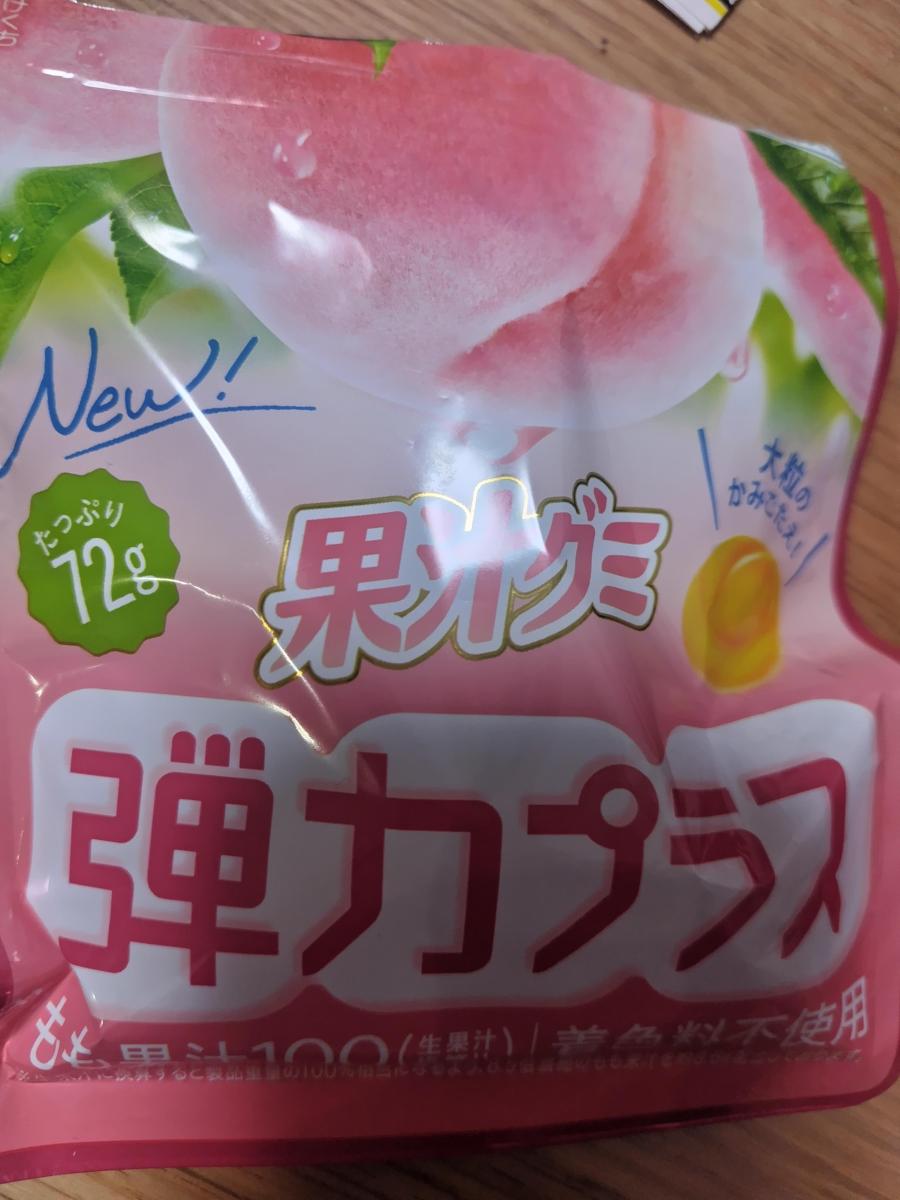 果汁グミ弾力プラスから、ももの味が出ていました。もも果汁100%、着色料不使用だそうです。うれしいです。
