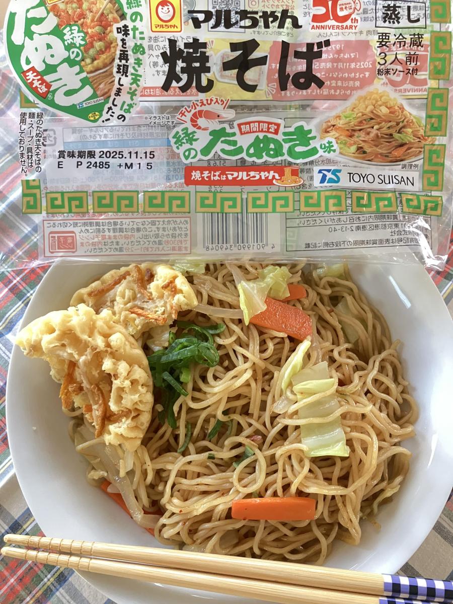 できあがって香りを確認すると…まぁなんとびっくり…本当に「緑のたぬき」のスープの香りがする焼きそば。仰天コラボでしたね。