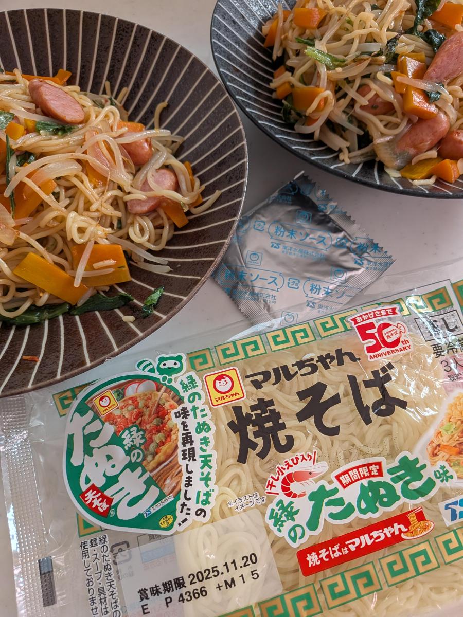 キャベツと人参と玉ねぎを具材として入れて作り、和風だしが香る粉末ソースを入れると緑のたぬきのスープの香りがする焼きそばが出来上がります。