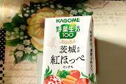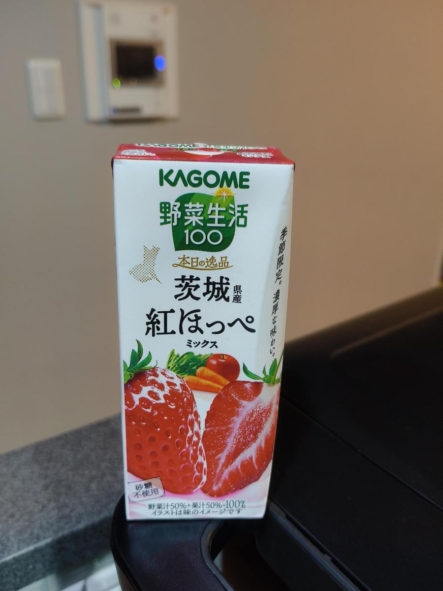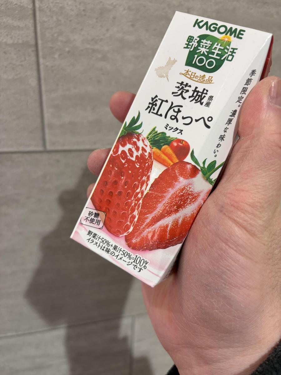 白地に真っ赤ないちごの絵が鮮やかです。茨城県産紅ほっぺを使った野菜生活100です。酸味が少ないという紅ほっぺに、ニンジン、トマト、りんご、ぶどうなどをミックスしているドリンクです。