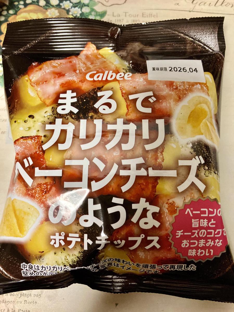 カリカリベーコンチーズのようなのネーミングに惹かれてどんな味か試したく購入してみました。袋開けると、ぶわっとベーコンのような香ばしい香りが食欲がそそります。チップスは、薄めですが、軽くカリカリ食感がよく、ベーコンの風味の後にチーズの塩気とピリリとしたコショウが効いておりおつまみにもぴったりな味わいだなと思います。量は少なめですが、味濃いめなのでちょうどいい量でした。