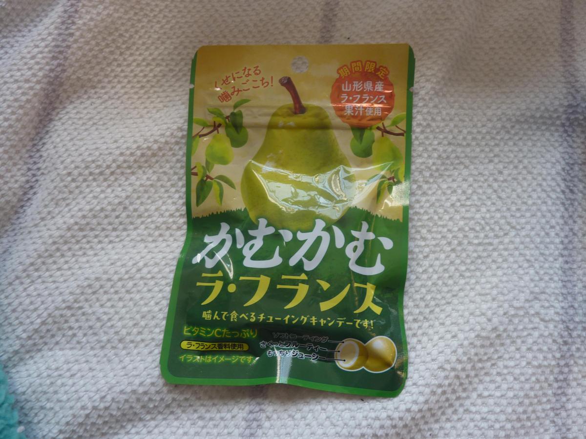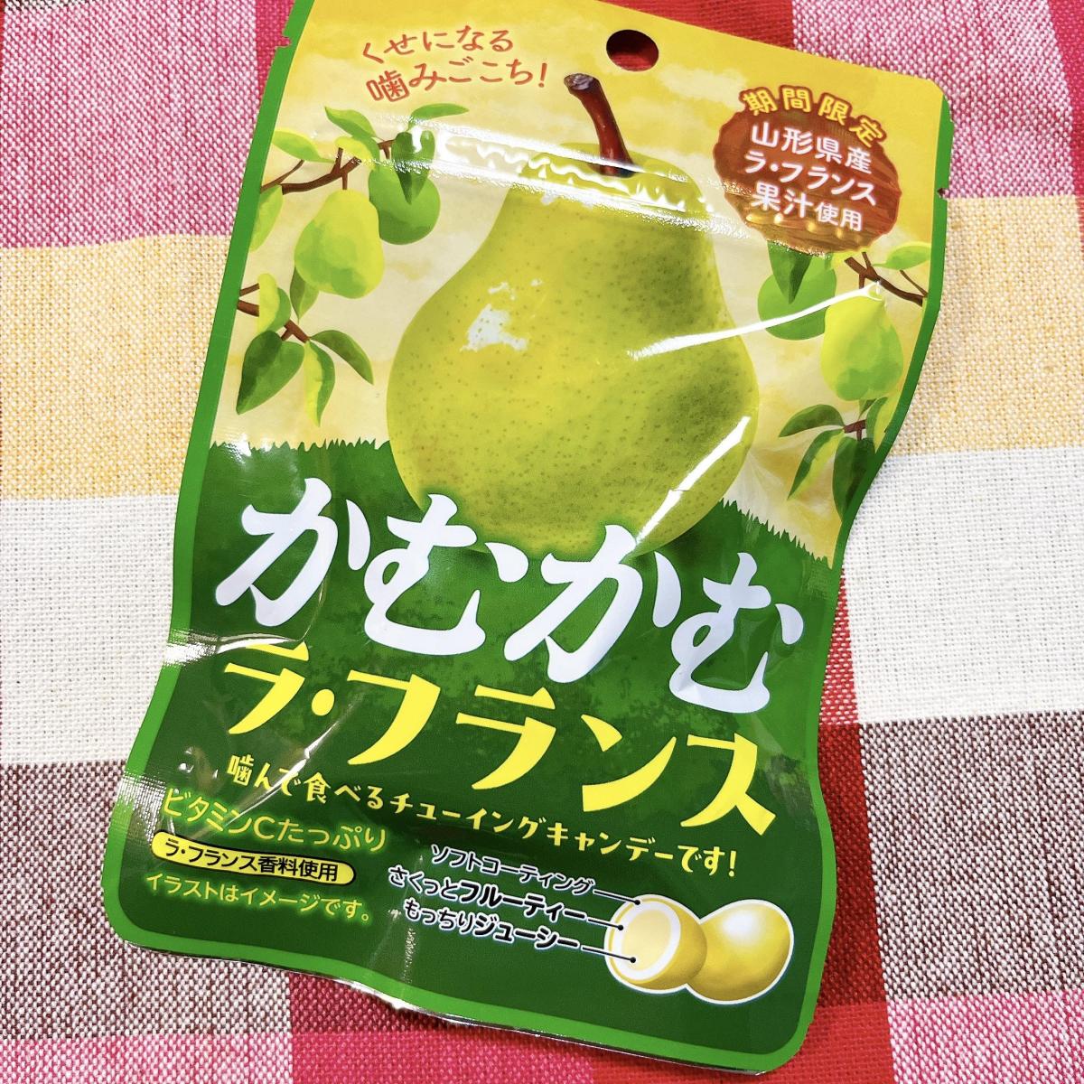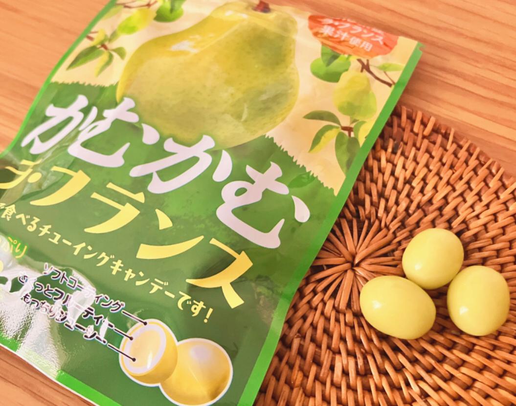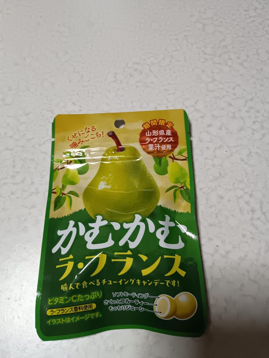 コンビニにて縁あって出会った商品です。定番のかむかむレモンを何回か食べましたが、黄色と緑のパッケージ、どーんと描かれたラ・フランスに興味を持ちました。開封すると、丸くてかわいい黄色だけど少しラ・フランスの皮に近い色です。口の中に入ると、爽やかな味がします。噛むとラ・フランスの甘味がじわりじわりとひろがります。香料を使っているとのことですが、ラ・フランスらしさがよく伝わる感じがします。だんだんとけてなくなっていくと、なんかさみしくなっちゃうほど美味しい商品です。