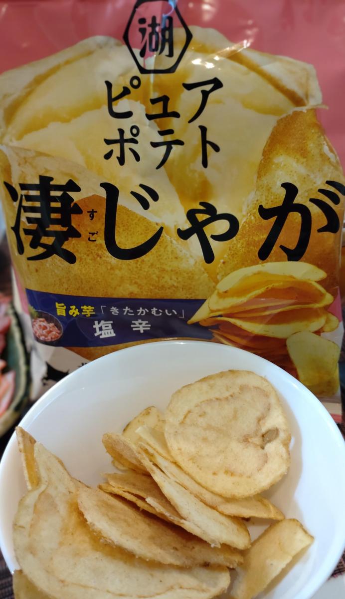 湖池屋「ピュアポテト凄じゃが キタアカリ塩辛味」は、じゃがいもの甘みと塩辛の旨みが意外なほど相性抜群。厚切りのザクッとした食感がクセになり、濃厚だけどしつこくない味わいですが、一方で独特のクセもあるので、好みは別れるかもしれません。