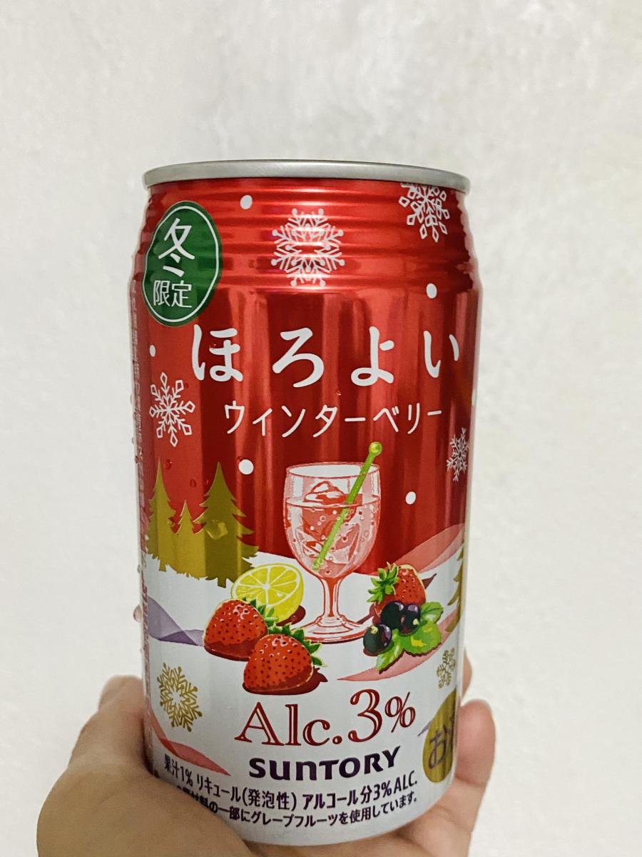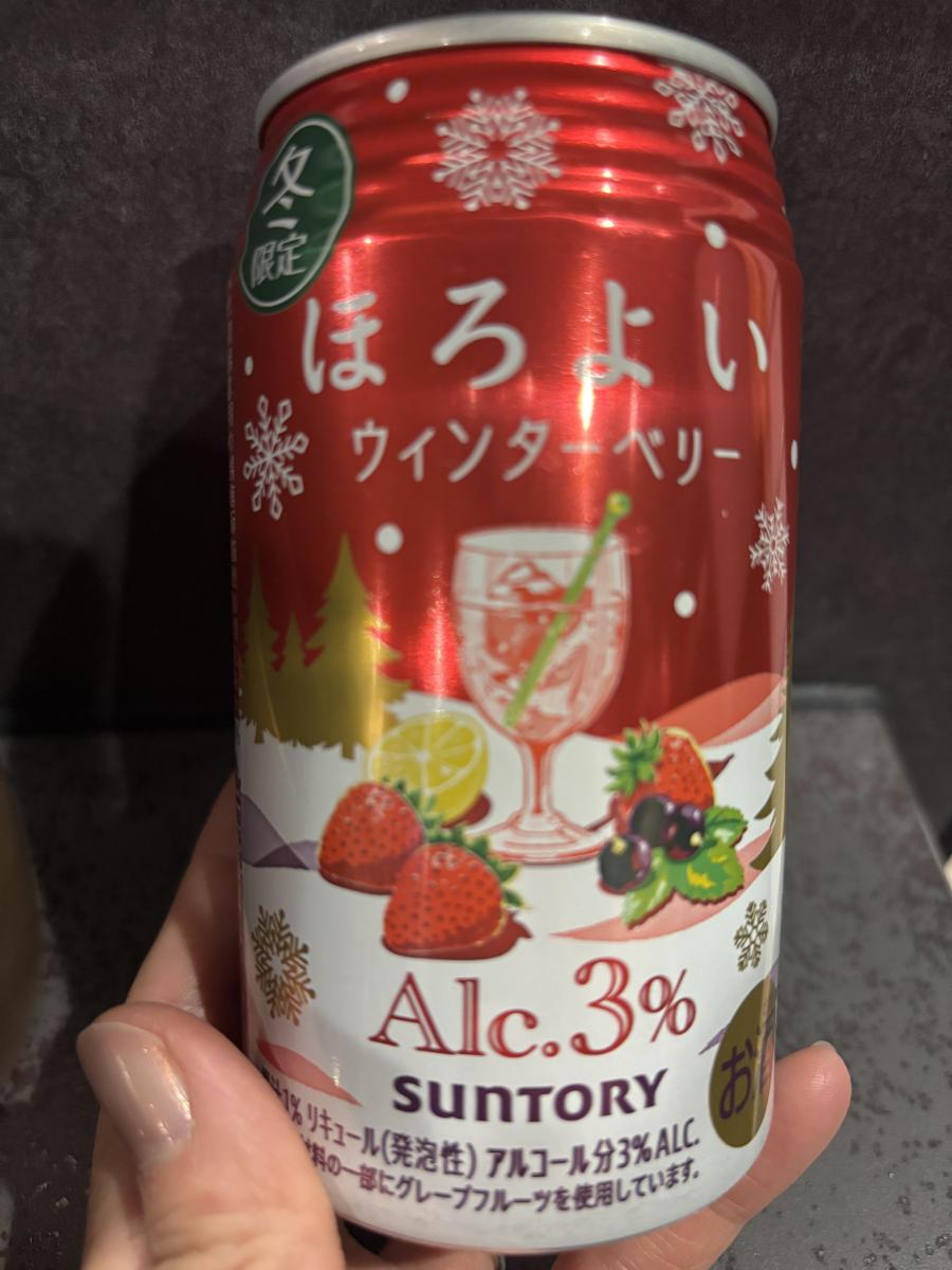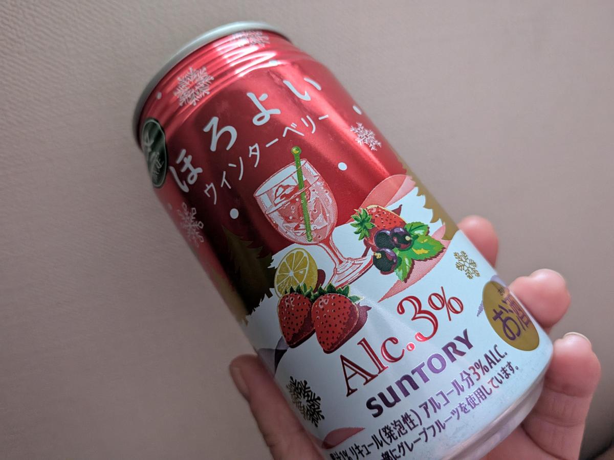 ほろよいのウィンターベリー、名前の通りクリスマスっぽい華やかな外観がかわいいですね。グラスに注ぐと薄い赤ピンクなのもかわいい!シャンメリーを彷彿とさせる微炭酸に、ほんのりベリーの風味があるのが爽やかで良いです。甘ったるすぎず飲めるので美味しかったです。