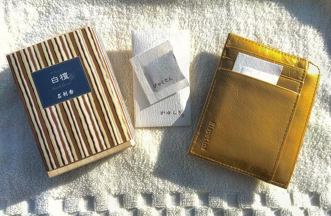 今月のおすすめとして名刺香の紹介です。年末から年始に移り変わるこの時期には財布を新調する方も一定数いらっしゃると思います。私はずれた時期に既に財布を替えていたので、新しい年を迎えるにあたり清める意味で香りづけの品を入手、この製品を選びました。財布に忍ばせるので小さめで厚みのない品、そして欲しかった白檀の香りの取り扱いありだったのが決め手でした。投稿写真中央の かゆらぎ と記載ありの白い小袋が実物で、長辺が5cm未満・厚みもわずかです(写真右は財布外ポケットからわざと覗かせているだけで、見えないようにポケットにちゃんと収まります)。コンパクトな桐箱1箱に6袋入。